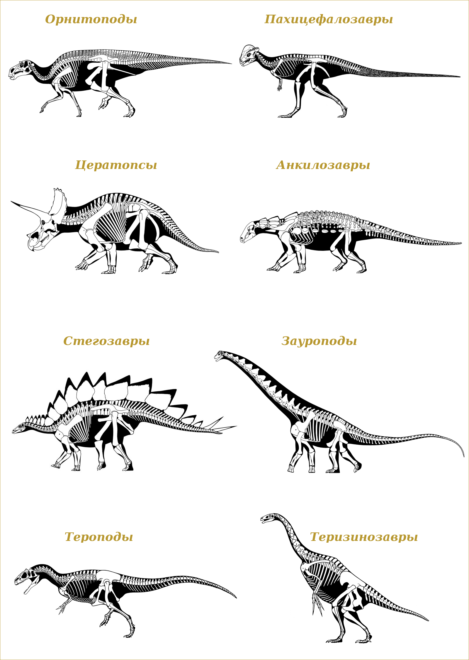 Латинский термин Dinosauria происходит от древнегреческих слов "ужасный ящер". Он был введён известным английским палеонтологом и зоологом Ричардом Оуэном в 1842 году. Под Dinosauria стоит понимать широкую группу (в традиционной ранговой классификации — надотряд) сухопутных пресмыкающихся, обитавших в мезозойскую эру (231,4 – 66 миллионов лет назад) и объединённых рядом общих признаков. Важнейшим из последних является строение тела, в частности тазовых костей. Ниже представлена сравнительная схема тазобедренной части наземных животных.  Модель слева присуща земноводным и большинству пресмыкающихся: как видите, ноги изогнуты и расставлены по бокам. Центральная свойственна динозавру или млекопитающему: конечности расположены перпендикулярно корпусу. Последние – вымершие триасовые равизухи. В свою очередь очередь представители динозавров делятся на 8 отрядов: орнитоподы (Ornithopoda), пахицефалозавры (Pachycephalosauria), цератопсы (Ceratopsia), анкилозавры (Ankylosauria), стегозавры (Stegosauria), зауроподы (Sauropoda), тероподы (Theropoda) и теризинозавры (Therizinosauria). Общая модель каждого показана на иллюстрации (использованы скелетные реконструкции Скотта Хартмана).  Обращаем внимание, что ни морские, ни крылатые древние ящеры не являются динозаврами, а причислены к отдельным отрядам рептилий, которых мы тоже рассмотрим позднее.