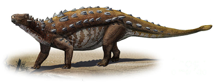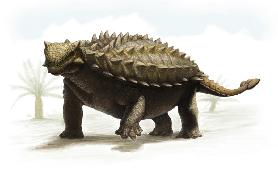 Время и место существованияСуществовали таларуры в конце мелового периода, около 98 – 83 миллиона лет назад (с сеноманского по сантонский ярус). Были распространены на территории современной Монголии.![]() Андрей Атучин изобразил особь, обладающюю недюжим аппетитом. Последний факт подтверждается реальными объёмами таларура (смотрите скелет ниже), значительную часть которых занимали пищеварительные органы. Виды и история обнаруженияНыне известен единственный вид – Talarurus plicatospineus, соответственно являющийся типовым.Таларур (в популярных источниках часто встретите некорректный перевод – таларурус) был впервые обнаружен советской экспедицией в начале 50-х годов двадцатого века в формации Баян Ширен (в нашей литературе известна как Баянширенская Свита). Это юго-восточная область пустыни Гоби (Монголия). Описан в 1952 году палеонтологом Евгением Малеевым на базе нескольких экземпляром PIN 557, представляющих собой фрагменты скелетов шести особей и два фрагмента черепа (код голотипа PIN 557/91). Также известен ещё один частичный череп таларура (образец 3780/1). Был изначально отнесён к анкилозавридам, но позднее ряд учёных причислял его к нодозавридам (Хуэн, Кун и Ромер). Сейчас чётко классифицируется как представитель семейства анкилозаврид. В начале статьи мы уже объяснили название рода. Имя же вида plicatospineus переводится с латыни как "сложенный позвоночник". Строение телаДлина тела таларура достигала 6 метров. Высота же до 2 метров. Весил он до 2 тонн.![]() Подчеркнём, что из-за фрагментарности скелетов пока нет возможности получить точную длину динозавра, поэтому оценки варьируются в интервале от 4 до 6 м. Передвигался таларур на четырёх столбовидных коротких ногах, заканчивающихся столь же короткими пальцами с плоскими когтями. На передних находилось пять ярко выраженных пальцев, а на задних четыре. Голова была небольшой, не такой массивной и высокой как у родственного анкилозавра или пинакозавра: приблизительно 24 сантиметра длиной и 22 шириной. Грудная клетка широка и отражает плотное округлое телосложение таларура. Органы пищеварения занимали значительную внутреннюю область. Теперь перейдём к самым выдающимся частям тела таларуров. На спине динозавров находился настоящий панцирь из плоских костных пластин. Вдобавок он был покрыт симметричными рядами заострённых шипов, которые уплощались ближе к бокам. У групп небольших хищников почти не было шансов прорваться сквозь такую толстую стену. Второй признак анкилозаврид таларуров – наличие органической дубины на конце хвоста. Она состояла из двух срощенных костных ядер и явно предназначалась для активной обороны. При этом прилегающий хвостовой отрезок имел жёсткую форму, дабы выдерживать удары и делать их акцентированными. Предположительно, булава по совокупности параметров серьёзно уступала подобной у анкилозавра, но её было вполне достаточно, чтобы нанести травму соразмерному хищнику. При приближении последнего таларур поворачивался к нему вполоборота (не теряя одним глазом из виду) и начинал размахивать своим орудием из стороны в сторону. Естественно, в радиус действия попадали в основном ноги животных. ![]() У художника Сергея Красовского таларур обладает более лёгкой комплекцией. Скелет таларураНа фото представлен экспонат вида Talarurus plicatospineus, выставленный в Палеонтологическом 