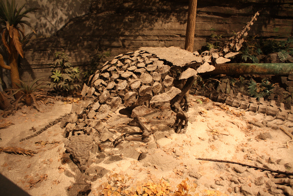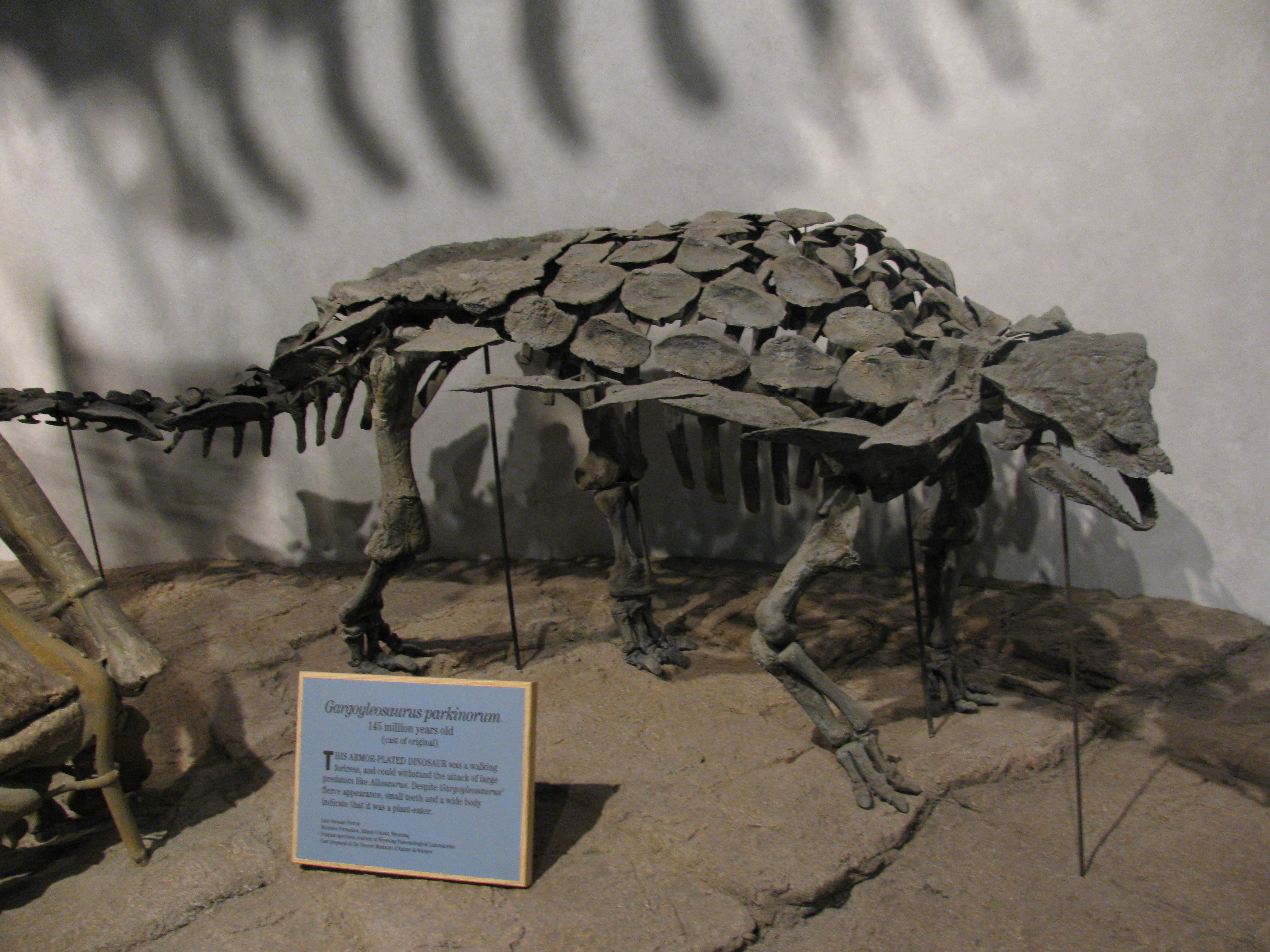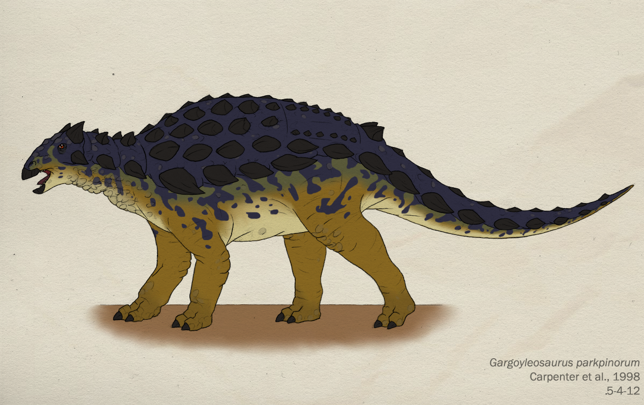 Время и место существованияСуществовали гаргойлеозавры в конце юрского периода, около 154 – 150 миллионов лет назад (конец киммериджского и начало титонского яруса). Были распространены на северо-западе Соединённых Штатов Америки, в штате Вайоминг.![]() Трёхмерное воплощение ящера-гаргульи от эстонского художника Рауля Луниа. Виды и история обнаруженияНыне известен единственный вид – Gargoyleosaurus parkpinorum, соответственно являющийся типовым.Первые останки гаргойлеозавра были обнаружены командой Дж. Паркера и Т. Пинегара из Западной Палеонтологической Лаборатории на западе карьера Бон Кабин (округ Олбани, штат Вайоминг, США) в 1996 году. Это одна из областей богатейшей формации Моррисон (стратиграфическая зона №2). Описали гаргойлеозавра американские палеонтологи Кеннет Карпентер, Клиффорд Майлс и Карен Кловард в 1998 г. Голотип, состоящий из почти полного черепа, частичного посткраниального скелета и большей части остеодерм, получил ярлык DMNH 27726 (смотрите фотографию в следующих подразделах). Учитывая хорошее состояние, это была крайне удачная находка. В дальнейшем этот экземпляр гаргойлеозавра был передан в распоряжение Денверского Музея Науки и Природы и пребывает там по сей день. ![]() Рельефный вид сверху от японского палеохудожника Минэо Сираиси. Родовое имя Карпентер и коллеги позаимствовали из архитектурной базы украшений. Внешность панцирного ящера им показалась настолько гротескной, что они сравнили её с так называемыми гаргульями – готическими внешними элементами зданий (а иногда и конструкциями практического назначения, такие как водостоки) в виде крылатых монстров с открытыми пастями. В свою очередь модель оных вместе с именем пришла из старинных французских легенд. По ним в реке Сена близ города Руан когда-то обитала гигантская драконовидная змея Гаргулья. Она терроризировала близлежащие порты, пока не была побеждена общими усилиями горожан. В продолжение темы названий заметим, что учёные изначально присвоили динозавру видовое имя Gargoyleosaurus parkpini. Это соединение двух первых слогов из фамилий первооткрывателей гаргойлеозавра – Дж. Паркера и Т. Пинегара. Однако оказалось, что имя не соответствовало номенклатурным правилам (окончание -i некорректно, если название дано в честь нескольких людей), поэтому в 2001 г. тем же Карпентером и коллегами оно изменено на Gargoyleosaurus parkpinorum. Отметим также, что были найдены ещё два частичных скелета гаргойлеозавров, но они ещё не описаны и находятся на стадии изучения. Строение телаДлина тела гаргойлеозавра достигала 4 метров. Высота же до 1,3 метра. Весил он до 1 тонны.![]() В сопоставлении использована скелетная реконструкция Кеннета Карпентера. Передвигался динозавр на четырёх коротких крепких ногах. При этом отметим, что передние конечности были довольно длинными и сильными. Несмотря на небольшой размер, он уже обладал значительной массой и поэтому перемещался лишь немногим быстрее более поздних сородичей. Череп у гаргойлеозавра вытянутый и не очень массивный, ибо слой костной брони довольно умеренный. Его длина достигала 29 сантиметров. Туловище ящера было широким и уплощённым. Мало того что гаргойлеозавр обладал толстой кожей, так ещё сверху его покрывали ряды защитных остеодерм – костных пластин. Броня была довольно внушительной, особенно в сравнении с близкими родами, поверхность 