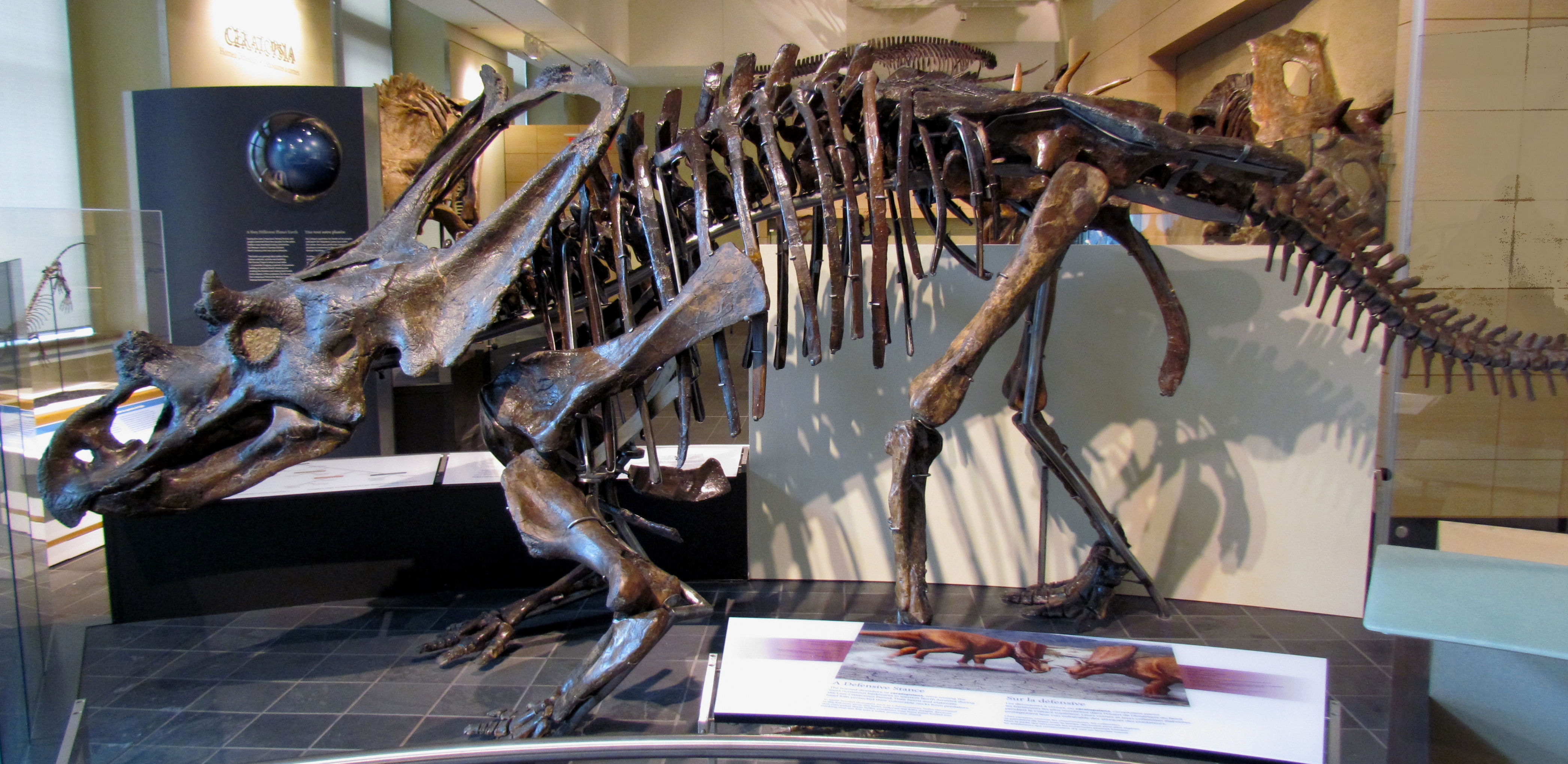 Последний отрезок мезозойской эры крайне благоприятен для развитии рогатых ящеров. Посмотрите на одного из тогдашних канадских обитателей. Латинское название Chasmosaurus происходит от древнегреческих слов – открытый ящер. Это связано с уникальным воротником, в котором имелись просторные окна. Как вы знаете, у большинства цератопсов костяная оборка носила в первую очередь защитные функции, но у данного представителя они явно были вторичны.