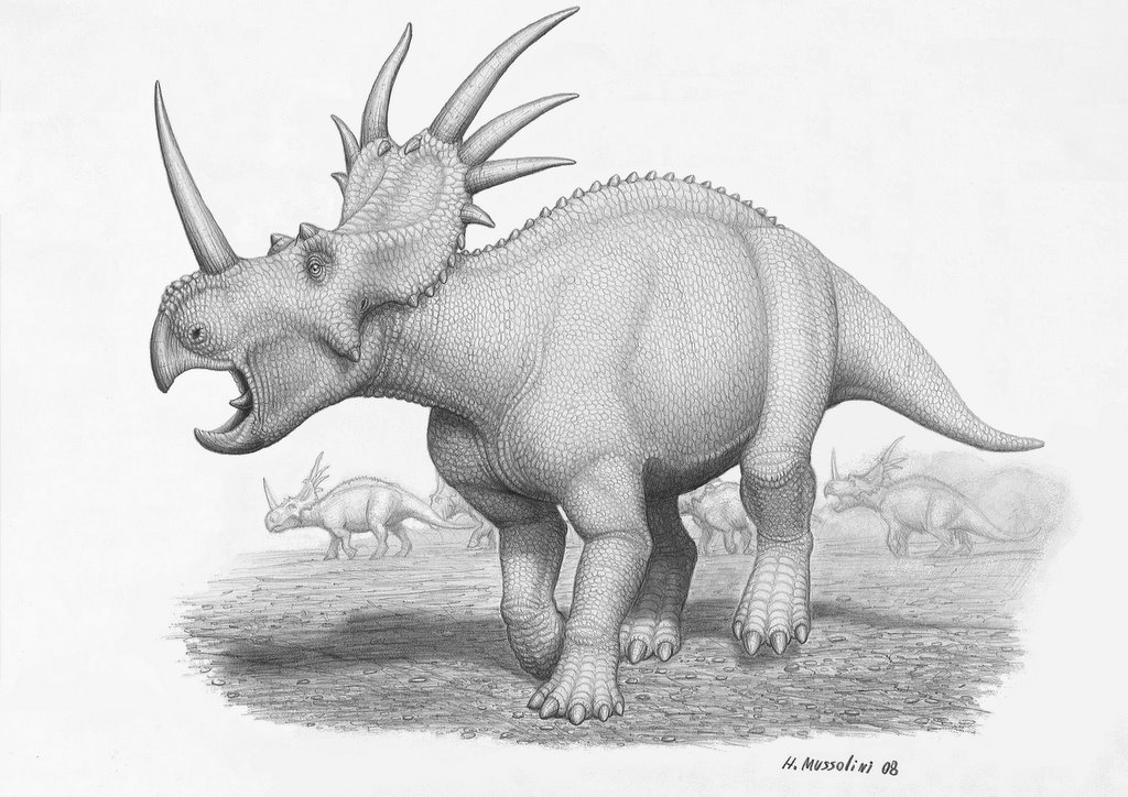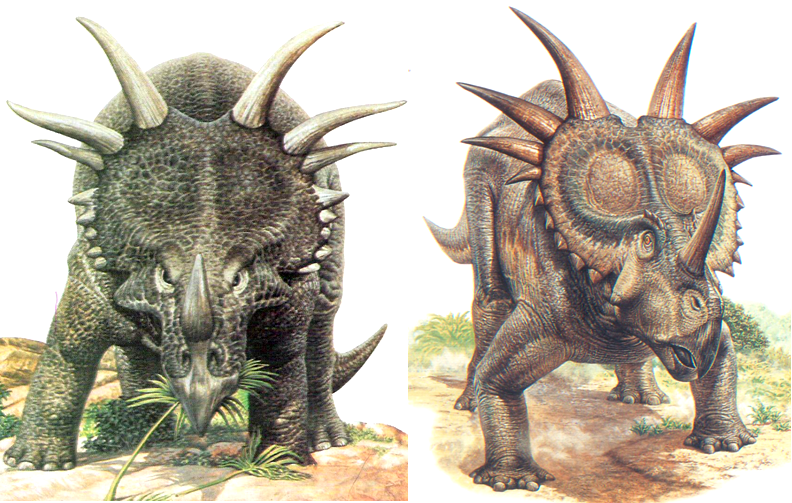 Время и место существованияСуществовали стиракозавры в конце мелового периода, около 76,5 – 75 миллиона лет назад (середина кампанского яруса). Были распространены на территории современной Канады (провинция Альберта).![]() Эстонский 3D-дизайнер Рауль Луниа так изобразил защиту стада стиракозавров от грозного предка тираннозавра – дасплетозавра: выстроившиеся в линию и поднявшие рога самцы не дают сделать неожиданный выпад. Виды и история обнаруженияНыне общепризнан единственный вид – Styracosaurus albertensis, соответственно являющийся типовым.Первые окаменелые останки стиракозавра были обнаружены американо-канадским палеонтологом Чарльзом Мортрамом Штернбергом (сыном другого известного учёного Чарльза Хазелиуса Штернберга) в формации Парк Динозавров (провинция Альберта, Канада) в самом начале 20-го века. Описание же стиракозавру дал канадский палеонтологом Лоуренсом Ламб в 1913 году. В начале статьи мы объяснили название стиракозавра, имя же вида albertensis переводится с латыни как "альбертский". Как легко догадаться, оно даровано в честь места обнаружения – канадской провинции Альберта. Затем уже в 1935 г. тот же карьер повторно исследовали специалисты Королевского Музея Онтарио. В результате были обнаружены недостающие части ископаемого стиракозавра, включающие нижнюю челюсть и достаточно хорошо сохранившийся скелет. ![]() Две разновременных иллюстрации английского художника Джона Сиббика, демонстрирующие стиракозавра спереди: на правой более поздняя с корректной постановкой стоп и пальцев. Но особенно впечатляющей была вторая находка. В рамках экспедиции Американского Музея Естественной Истории под предводительством американского палеонтолога Барнума Брауна был найден почти полный скелет стиракозавра, сочленённый с черепом. Находка сделана в 1915 в той же формации, на сей раз близ небольшого поселения Стиввиль. Экземпляр получил идентификационный номер AM5372. Браун и коллега Эрих Марен Шлейкджер приняли решение о выделении нового вида Styracosaurus parksi на базе некоторых отличий черепа, а также меньшого размера хвостовых позвонков. Имя дано в честь канадского геолога Уильяма Паркса. Но сегодня, учитывая неполноту черепа данного стиракозавра и немалую часть искусственно восстановленных его деталей, принято причислять экземпляр к типовому виду. Однако совсем недавно, в 2006 году происходит интересное событие: канадский палеонтолог Даррен Танке (Королевский Музей Онтарио) отыскал место раскопок AM5372, длительное время считавшееся утерянным. В карьере были найдено большинство недостающих фрагментов черепа стиракозавра AM5372, которые по видимому были потеряны при транспортировке. Поэтому высока вероятность, что в ближайшем времени мы получим повторную реконструкцию черепа Styracosaurus parksi и узнаем, действительно ли он так отличается от типового. Помимо них за всё время с момента открытия команда Королевского Музея обнаружила ещё несколько фрагментов черепов стиракозавров. Строение телаДлина тела стиракозавра достигала 5,5 метров. Высота же до 2 метров. Весил он до 2,7 тонны.![]() Передвигался динозавр на четырёх крепких полусогнутых ногах, при этом передние были меньше задних. Высота стиракозавра в бёдрах достигала 1,65 м. Обладал мощным черепом с ороговевшим подобием клюва. Теперь переходим к главной достопримечательности стиракозавра – уди
