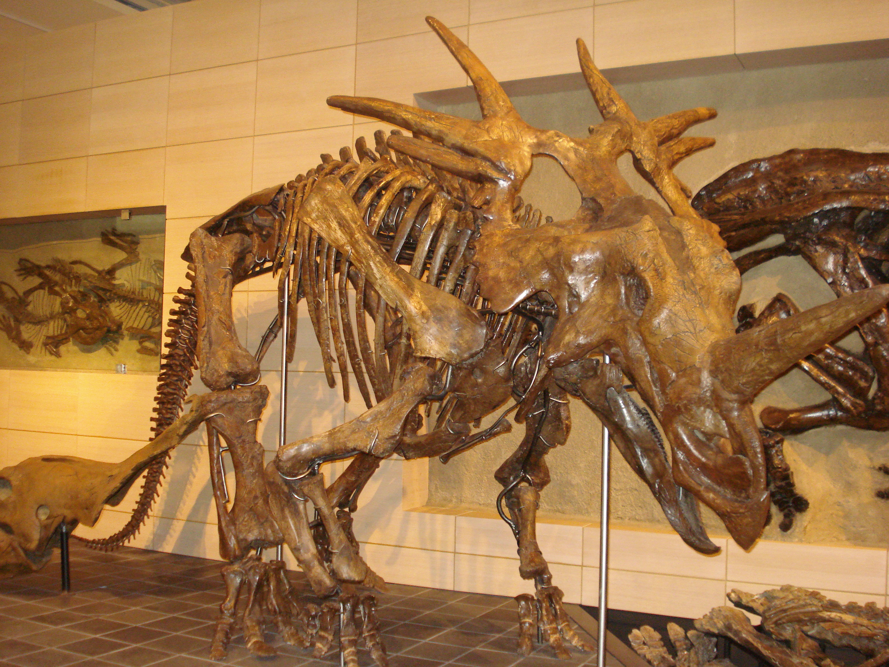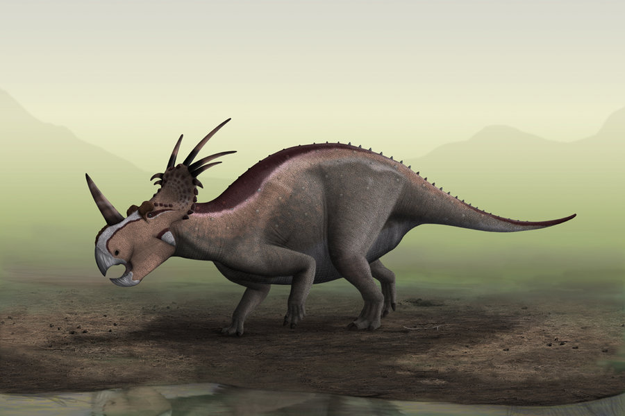 О рогатом динозавре, обитающем в доисторической Канаде, можно с уверенностью сказать – один из самых красивых. Латинское название Styracosaurus происходит от древнегреческих слов – шипастый ящер (более точный перевод – ящер наконечников копий). Его он получил благодаря необычному строению воротника: на нём располагался симметричный ряд рогов. Они являлись не только украшением, но и надёжной защитой от хищников, стремящихся добраться до шеи.