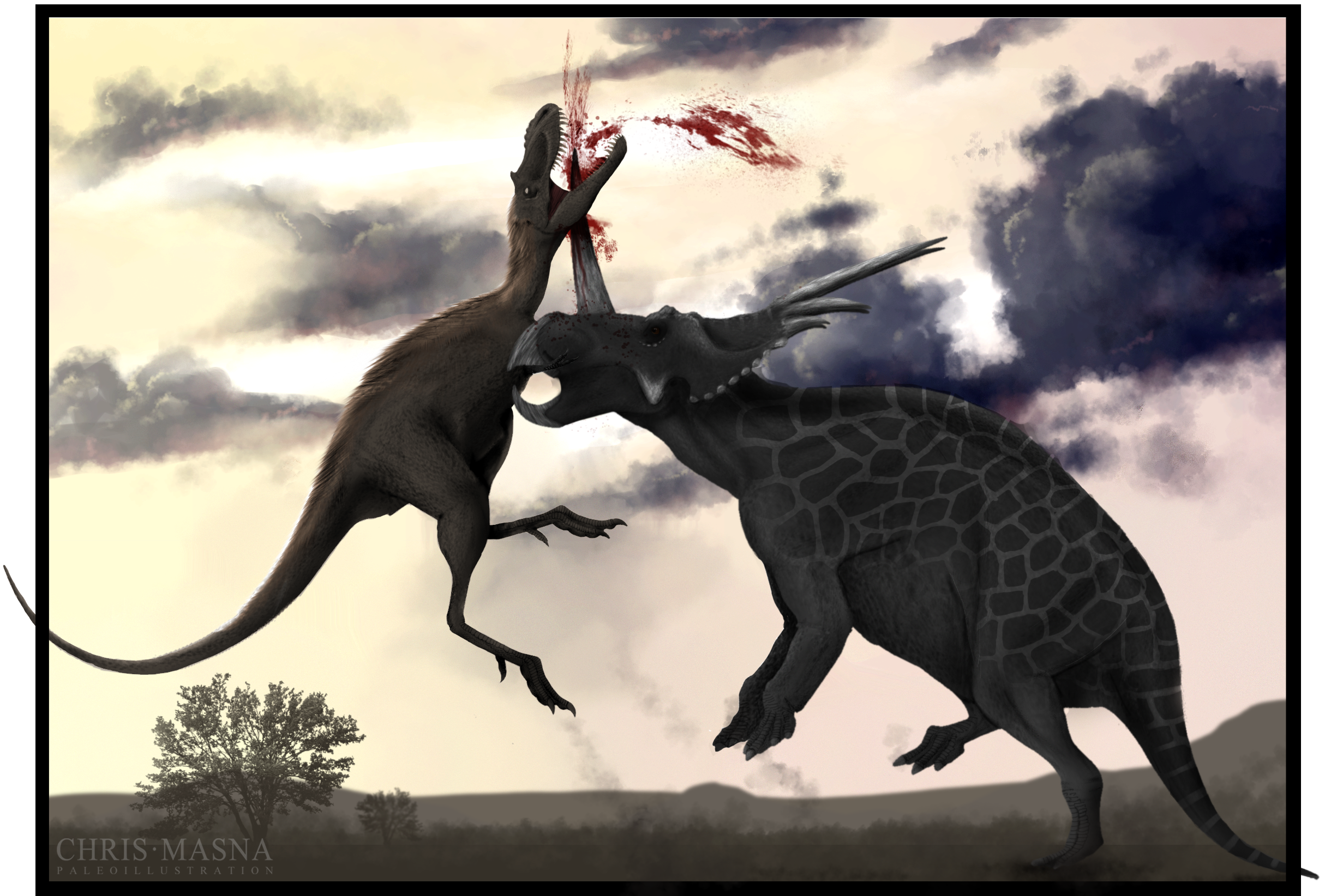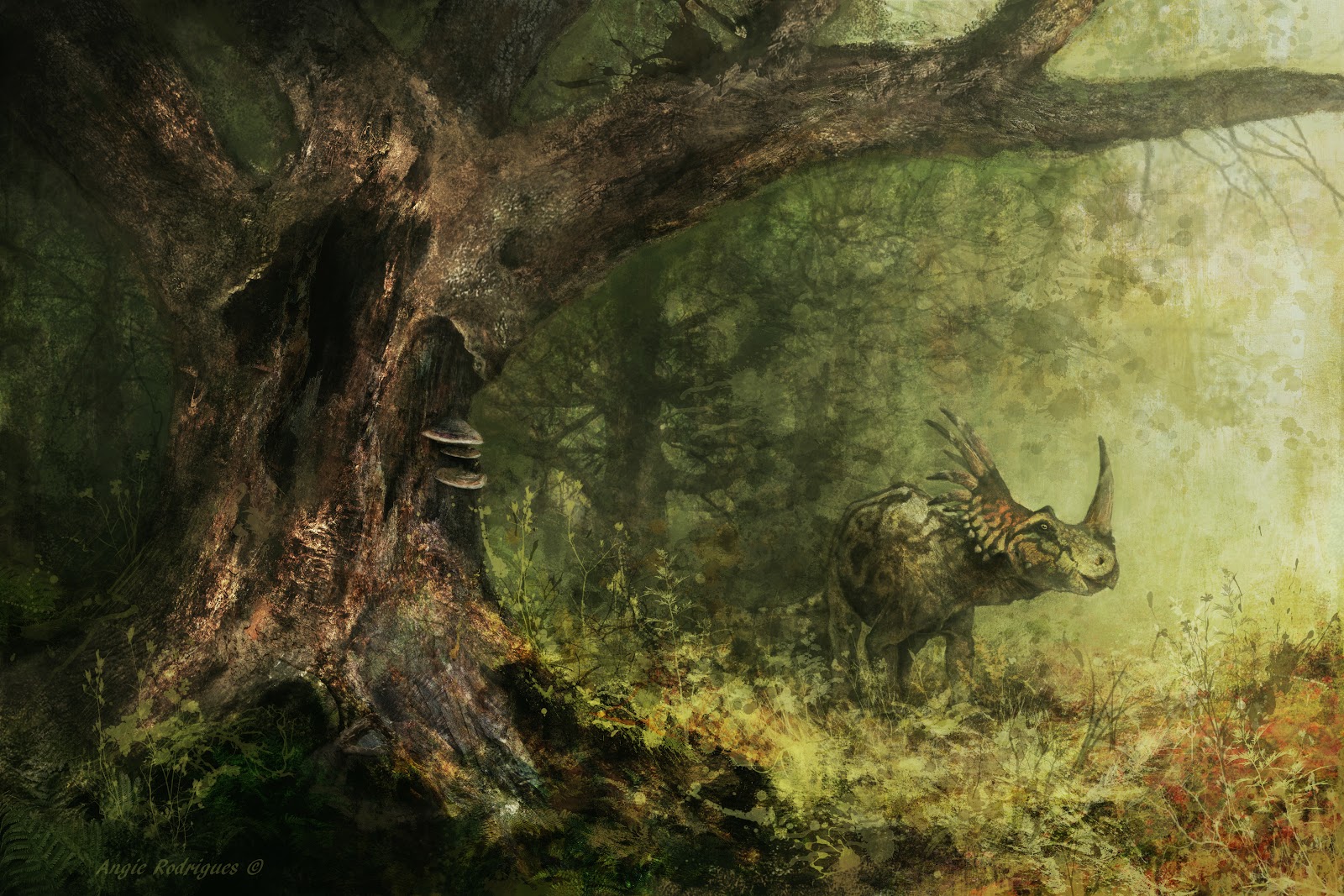Питание и образ жизниОбширные территории формации Парк Динозавров в те далёкие времена пестрели питательной растительностью. Зелёные равнинные зоны облюбовали рогатые динозавры, такие как центрозавры, хасмозавры и, конечно же, рассматриваемые стиракозавры.![]() Атмосферная композиция американского пейзажиста Энджи Родригеса: в глубокой чаще стоит одинокий стиракозавр, возможно спасаясь от летней жары. Солидные стада шипастых цератопсов неторопливо ощипывали низкорослую растительность. О последнем свидетельствует расположение головы. Своими мощными роговыми клювами они были способны отрывать не только ветви кустарников, но и даже деревьев (нижние ветви могли сначала прижиматься к земле с помощью рогов). Возможно, чтобы добраться до сочных листьев, иногда намеренно валились молодые покрытосеменные деревья. Стиракозавр был прекрасно вооружён. Багаж острых шипов на воротнике, который сам по себе являлся внушительным щитом, многократно усиливало главное оружие – носовой рог. Им можно было нанести травму даже крупному тероподу. А таковых было предостаточно. Ведь здесь обитало одновременно два крупных тираннозаврида – горгозавр и дасплетозавр. ![]() Молодой горгозавр, выцеливающий детёныша в стаде стиракозавров, неожиданно столкнулся со взрослой мужской особью. Автор сцены: аргентинский палеохудожник Кристиан Маснагетти. Со взрослыми же особями этих хищников проблематично было справиться в одиночку даже крупному стиракозавру-самцу. Поэтому могла иметь место коллективная оборона, когда динозавры выстраивались в ряд или полукруг, встречая приближающегося гиганта. На детёнышей стиракозавров, ненароком ушедших от взгляда родителей, могли также нападать группы подвижных дромеозавров. Судя по всему, в этой местности было довольно много рек и озёр. Возможно, что во время разливов первых и были затоплены некоторые обнаруженные образцы стиракозавров. Недавняя находка кладбища центрозавров, содержащего сотни особей, только подтверждает сии предположения. Соседствующие хищные противникиРастительноядные соседиБлизкие родаГалерея рисунковЩелкните на интересующую миниатюру для увеличения. Снизу указан художник.