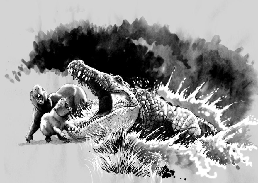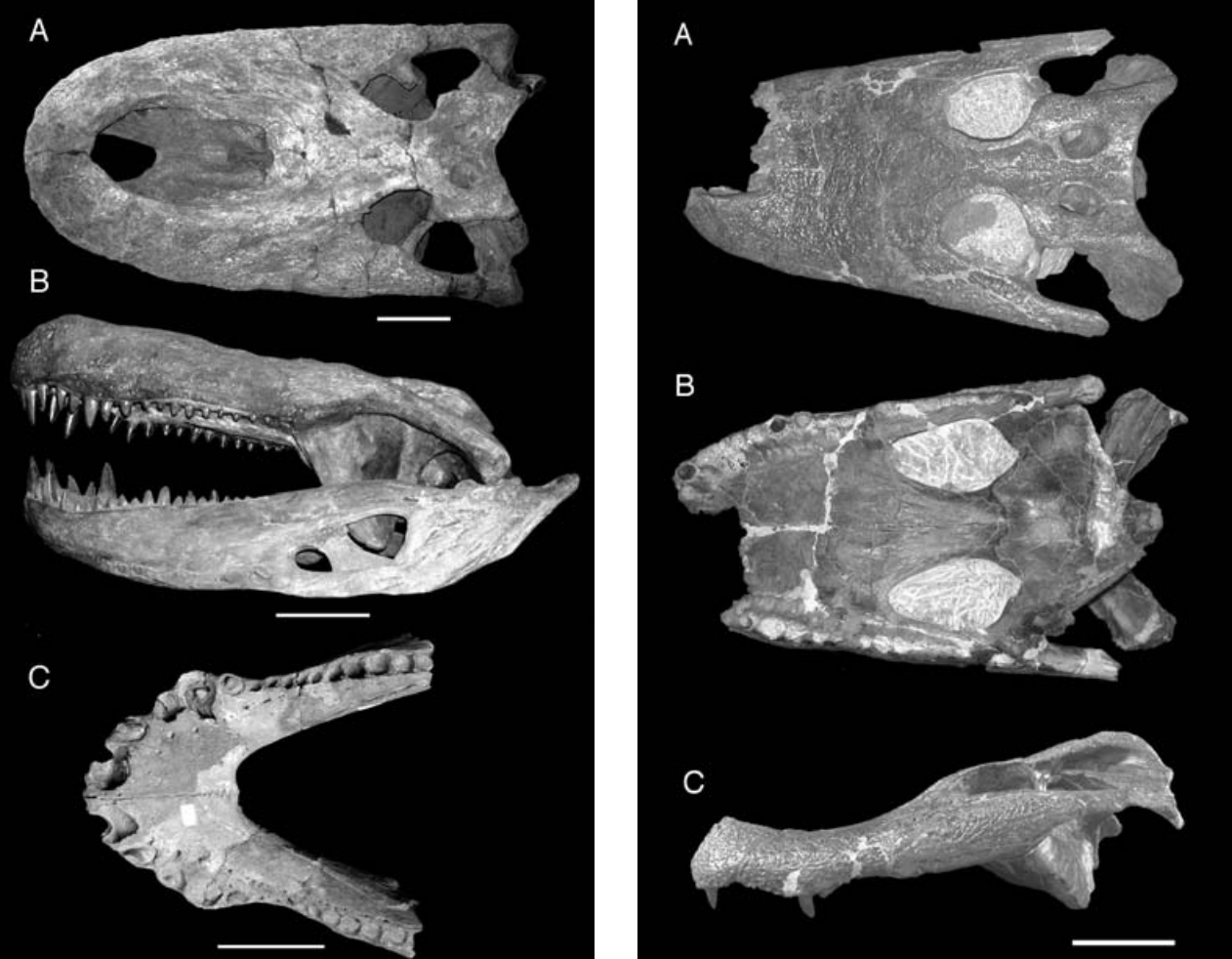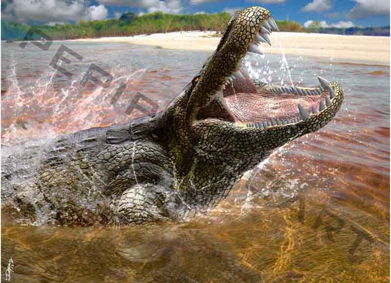Время и место существованияСуществовали пурусзавры с середины по конец миоценового отдела неогенового периода, около 15,97 – 5,332 миллиона лет назад (с лангского по мессинский ярус). Были широко распространены на территории Южной Америки: в Бразилии, Перу, Колумбии и Венесуэле.![]() Иллюстрация бразильского художника Марсело Вианы. Пара пурусзавров лежит на берегу, спокойно встречая приближающуюся стихию. Виды и история обнаруженияНыне известно три вида – Purussaurus brasiliensis (типовой), Purussaurus neivensis и Purussaurus mirandai.История у них достаточно богата. Первый вид пурусзавра (Purussaurus brasiliensis) был описан известным бразильским ботаником Жоаном Барбозой Родригесом ещё в 1892 году. В основу легли окаменелости, обнаруженные в формации Солимойнс (в районе реки Пурус, Бразилия). В начале статьи мы объяснили родовое название пурусзавра. Видовое же имя brasiliensis переводится с латыни как "бразильский". Легко догадаться, что дано оно в честь родной крокодилу страны. ![]() Однако в 1936 году американский палеонтолог Брайан Паттерсон отрицает самостоятельность пурусзавра и включает его в род обыкновенных кайманов, соответственно выделяя в вид Caiman brasiliensis. Но этот вариант не был лишь частично поддержан, хотя и встречается по сию пору в некоторой литературе. Отметим, что голотип Purussaurus brasiliensis (фрагмент нижней челюсти), описанный Родригесом, был впоследствии утерян. Зато ныне имеется несколько других образцов (в основном черепа и их фрагменты). Второй вид пурусзавра был описан американским палеонтологом Чарльзом Муком в 1921 году и отнесен к роду совсем другого крокодила – динозуха. Вид получает название Dinosuchus neivensis. Лёгшие в основу описания остатки были обнаружены между городом Нейвой и рекой Баче (Колумбия). При этом фрагменты другой челюсти с зубами были выделены Муком в род брахигнатозух (вид Brachygnathosuchus braziliensis). Затем в 1965 году американский палеонтолог Уанн Лэнгстон пересматривает обоих, по итогам причисляя к обыкновенным кайманам и выделяя вид Caiman neivensis. Наконец в 1989 бразильский учёный Жан Бокуэнтин Вильянуэва причисляет оных к пурусзавру. В его варианте вид получает название Purussaurus neivensis. Название было дано в честь колумбийского города Нейва, рядом с которым окаменелости были обнаружены. Голотип этого вида, частичный скелет, носит ярлык USNM 10889. Третий вид (Purussaurus mirandai) был описан группой южноамериканских палеонтологов (Оранхель Агилера, Дуглас Рифф и Жан Бокуэнтин Вильянуэва) совсем недавно, в 2006 году. В основу легли окаменелости пурусзавра из формации Урумако (Венесуэла). Имя дано в честь национального героя этой страны, Франсиско Миранды. Голотип получил идентификационный номер UNEFM-CIAAP-1369. Фотографии некоторых образцов представлены ниже (из работы "A new giant Purussaurus (Crocodyliformes, Alligatoridae) from the Upper Miocene Urumaco Formation, Venezuela", 2006 год). ![]() Слева образцы Purussaurus brasiliensis (масштабная линейка – 20 см): a – экземпляр UFAC 1118, вид сверху; b – реконструированный череп PUC-MG, вид сбоку; c – экземпляр DGM 527-R. Справа экземпляр INGEOMINAS DHL-45 Purussaurus neivensis (масштабная линейка – 10 см): a – сверху; b – снизу; c – сбоку. Строение телаДлина тела пурусзавра достигала 10,28 метров[1] (длиннейший экземпляр DGM 527-R, принадлежащий виду Purussaurus brasiliensis). Высота же до 1,4 метров. Весил он до 5,158 тонны.[1] Является крупнейшим представителем подсемейства каймановых, самым большим членом семейства аллигаторовых наряду с дейнозухом (Deinosuchus), и одни