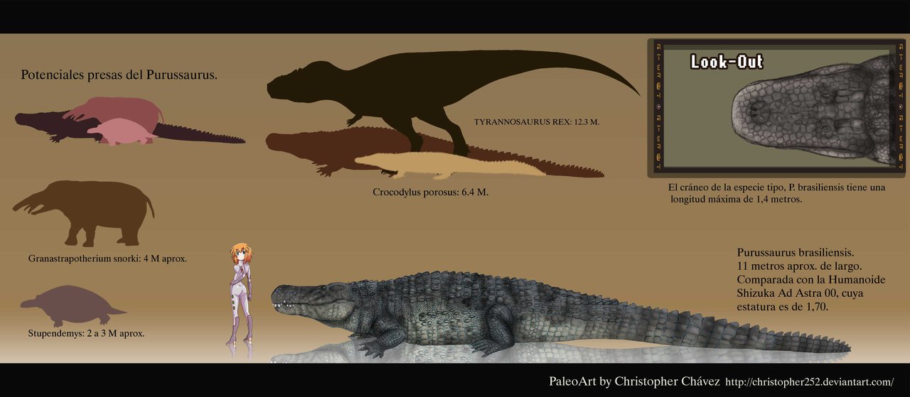 Гигантский доисторический родственник кайманов пока не приобрёл широкую известность. А между тем он обладал невероятным орудием, прекрасно подходящим для преодоления тяжёлой брони. Латинское название Purussaurus происходит от древнегреческого слова "ящер" и имени "Пурус". Это протяжённая река (а заодно и микрорегион), расположенная в Бразилии, месте его обитания.