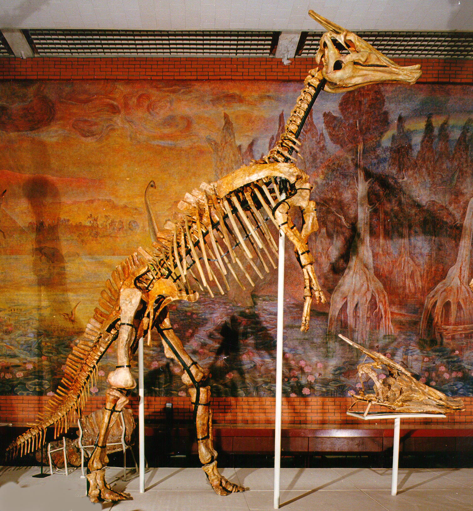 Время и место существованияСуществовали зауролофы в конце мелового периода около 69,5 – 68,5 миллиона лет назад. Были распространены на территории Северной Америки и Монголии.![]() Объемная иллюстрация Пола Харпера, демонстрирующая динозавра в родной среде. Виды и история обнаруженияСейчас общепризнаны два вида: Saurolophus osborni (типовой) и Saurolophus angustirostris.Останки первого, включавшие почти полный скелет, были найдены американским палеонтологом Барнумом Брауном в канадской формации Хорсшу, ныне названной Эдмонтон (1911 г.). Описание вида опубликовано им в 1912 году. Название дано в честь коллеги Генри Фейрфилда Осборна, в то время являющего главой Американского Музея Естественной Истории. Результаты экспедиции были так впечатляющи и многообещающи, что способствовали появлению большого числа так называемых охотников за окаменелостями. Стартовала "динозавровая лихорадка" начала века. Спустя полвека (1947 год) международной экспедицией на юге монгольской пустыни Гоби был неожиданно обнаружен Saurolophus angustirostris. Описан этот вид русским палеонтологом Анатолием Рождественским в 1952 г. Богатая находка целого ряда скелетов различных возрастов сделала его одним из самых хорошо изученных азиатских гадрозавров. ![]() Автор рисунка: Андрей Атучин. Строение телаДлина тела зауролофа достигала 12 метров. Высота же до 5 м. Весил он до 2,5 тонн.![]() Американский представитель был несколько меньше азиата, достигая длины 10 метров, но даже это сопоставимо с размером большого автобуса. В рамках пастбищ зауролоф много времени проводил на четырёх конечностях, хотя легко передвигался и на двух. Потому передние конечности заканчиваются крепкими пальцами, с плоскими когтями, служащими не только удобными манипуляторами, но и отличной опорой. Череп вытянутый и уплощённый. В передней части черепа имеется подобие утиного клюва. Плотные ряды зубов располагались глубоко в пасти. Особенный интерес для учёных представляет сплошной костный гребень на макушке зауролофа, функции которого до сих пор точно неизвестны. Основные теории базируются на существовании кожного мешка, крепившегося к гребню и шедшего до конца морды. Возможно, что он был ярко раскрашен и сильно раздувался при криках, таким образом дополняя звуковые сигналы визуальными. Подобным образом, раздувая горло для усиления звука, квакают лягушки. Крики зауролофов благодаря звуковым резонаторам могли быть очень громкими. Таким образом у них существовала полноценная сигнальная система, позволяющая, в частности, предупредить о приближении опасности. Кроме того по особой "причёске" даже на расстоянии можно было увидеть сородича. Наконец, цветастый кожный мешок могли использовать подобно павлинам в брачных играх, периодически раздувая и горделиво покачивая головой. Мы считаем, что сразу несколько из вышеперечисленных функций имели место, делая из гребня многофункциональный инструмент. Скелет зауролофаПредставляем вашему вниманию скелет Saurolophus angustirostris (Палеонтологический Музей Имени Ю.А.Орлова, Москва).![]() На следующем фото крупно показаны несколько черепов из той же экспозиции.