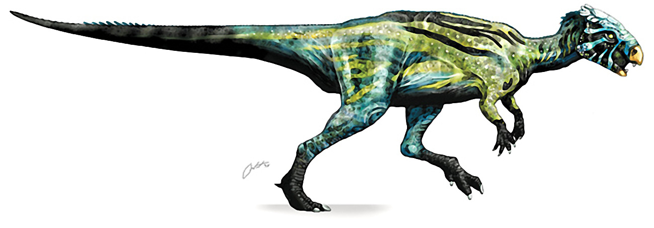 Время и место существованияСуществовали гойоцефалы в конце мелового периода, около 85,2 – 72,1 миллиона лет назад (поздний сантонский и кампанский ярус).[2][3][4] Были распространены на территории современной Монголии, в пустыне Гоби. Могут быть самыми древними из известных науке пахицефалозавров.![]() Иллюстрация плоскоголового ящера с GeoCities. Виды и история обнаруженияНыне известен единственный вид – Goyocephale lattimorei, соответственно являющийся типовым.Ископаемые остатки гойоцефала обнаружил монгольский палеонтолог Алтангэрэлийн Пэрлэ в местечке Боро-Ховил (в 10 км западнее Дзамын-Хонд, в 60 км западнее сомона Булган, аймак Умнеговь, юг пустыни Гоби, Монголия). Это произошло в 1977 году. Свита, к которой относятся породы, пока не получила собственное имя. Датировки красных песчаников в литературе тоже весьма расплывчаты (от позднего сантона до позднего кампана). ![]() Таким изобразил плоскоголового ящера американский палеохудожник Брайан Франчак. Описал гойоцефала в 1982 году интернациональный коллектив палеонтологов: Алтангэрэлийн Пэрлэ (Монголия), Тереза Марьянска (Польша) и Гальшка Осмольска (Польша). В начале статьи мы объяснили родовое название динозавра. Видовое имя lattimorei дано в честь известного англо-американского монголоведа Оуэна Латтимора. Голотип и единственный экземпляр гойоцефала получил ярлык GI SPS 100/1501. Он включает неполный череп с сохранившимся черепным сводом, нижнюю челюсть, зубы и частичный посткраниальный скелет.[1][2] ![]() Иллюстатор Хайме Хэдден (США) предлагает пахицефалозаврида с хвостом, покрытым волосовидными структурами. Строение телаДлина гойоцефала достигала 2,3 метров.[5] Высота же до 0,8 метров. Весил он до 40 килограммов.![]() Передвигался плоскоголовый динозавр на двух длинных ногах. Вероятно, был достаточно подвижным пахицефалозавром. Предположительно пятипалые верхние конечности были заметно короче задних. Длина черепа GI SPS 100/1501 достигает 23 сантиметров. В его строении наблюдаются общие черты с другим монгольским "плоскосводным", гомалоцефалом (Homalocephale). "Мастер клыка"Достопримечательностью гойоцефала считается отнюдь не только изящный и нестандартный черепной свод. Так, огромнейший интерес вызывают длинные клыкообразные зубы в передней части черепа, особенно первый нижнечелюстной и три на предчелюстной кости. Они легко могут составить конкуренцию не только зубам гетеродонтозавридов, но и вооружению отдельных хищных динозавров.![]() Верхняя челюсть гойоцефала. Реконструкция американского палеоиллюстратора Хайме Хэддена.[5] Для же чего миниатюрному пахицефалозавру понадобились устрашающие "клыки"? Пока в распоряжении палеонтологов слишком мало материала для точного определения. Версий достаточно много, и большинство имеют право на существование. Если гойоцефалы были всеядными, то зубы использовались при охоте на ящериц, насекомых и других мелких животных. Кроме того, они могли быть задействованы в состязаниях между самцами или при защите от соразмерных хищников. Отдельно стоит вариант повседневного "рабочего инструмента": с помощью клыков гойоцефалы могли выкапывать из земли корни или червей. А также ловко вскрывать термитники. ![]() На рисунке мы видим голову ящера крупным планом. Прочие аспектыПредположительно, туловище позднемелового динозавра было обтекаемым и лёгким. Традиционно для пахицефалозав