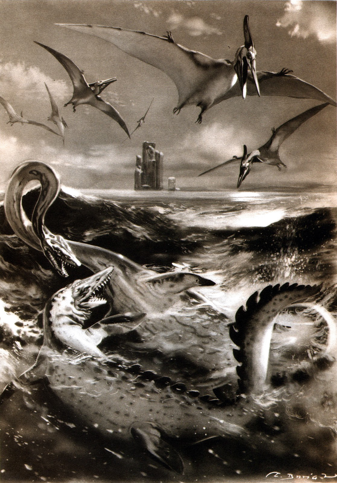 Биография Зденека Буриана![]() Родился Зденек Буриан в начале 20 века, 11 февраля 1905 года в небольшом чешском городе Копршивнице. Склонность к художественному искусству была замечена с ранних лет. Интересовался географией, в частности различными народами мира. Очень нравились приключенческие книги. Поэтому уже тогда он предпочитал рисовать в основном людей и живую природу, очень много времени проводя на открытом воздухе. Уже в этом возрасте Зденек Буриан старался добиваться максимального соответствия рисунка и оригинальной модели. Потому к зрелым годам чётко сформировался стиль, который можно назвать реализмом или академизмом. В нём чрезвычайно важны даже мельчайшие детали, а также достоверность объектов и их пропорций. Имеется твёрдая опора на анатомию современных животных и соответствие физическим законам. Изначально реализовал себя в качестве иллюстратора приключенческих произведений, а также книг про путешествия. В 16 лет Зденек Буриан проиллюстрировал книгу Роберта Стивенсона "Приключения Дэвида Бальфура". Это была первая настоящая работа и успех. С 1940 года начинается новый этап его карьеры, где твёрдо начали укореняться мотивы древности. ![]() Фотография Зденека Буриана непосредственно за работой. Скончался 1 июля 1981 года в Праге, в день открытия своей третьей в году выставки. Ему было 76 лет. Обладая особым трудолюбием и невероятной работоспособностью, он работал почти без перерывов на протяжении 60 лет. Ведь первые полноценные рисунки Зденека Буриана были созданы в 1921, а последние непосредственно перед смертью. Благодаря этому качеству и особому таланту он оставил огромное количество работ, которым мы можем дивиться по сей день. ![]() Его можно назвать полноправным учёным-палеонтологом, ибо вклад точных реконструкций в науку нельзя переоценить. Он делал множество самостоятельных выводов, ведя постоянные консультации с экспертами. Большое количество музеев России, Восточной и Западной Европы украшены работами Зденека Буриана в разных масштабах. Точность его реконструкций позволяет размещать оные непосредственно перед окаменелостями освещаемых животных. Галерея рисунковЩелкните на интересующую миниатюру для увеличения. Снизу указан фигурирующий род со ссылкой на статью.