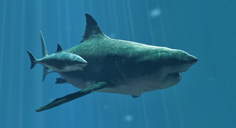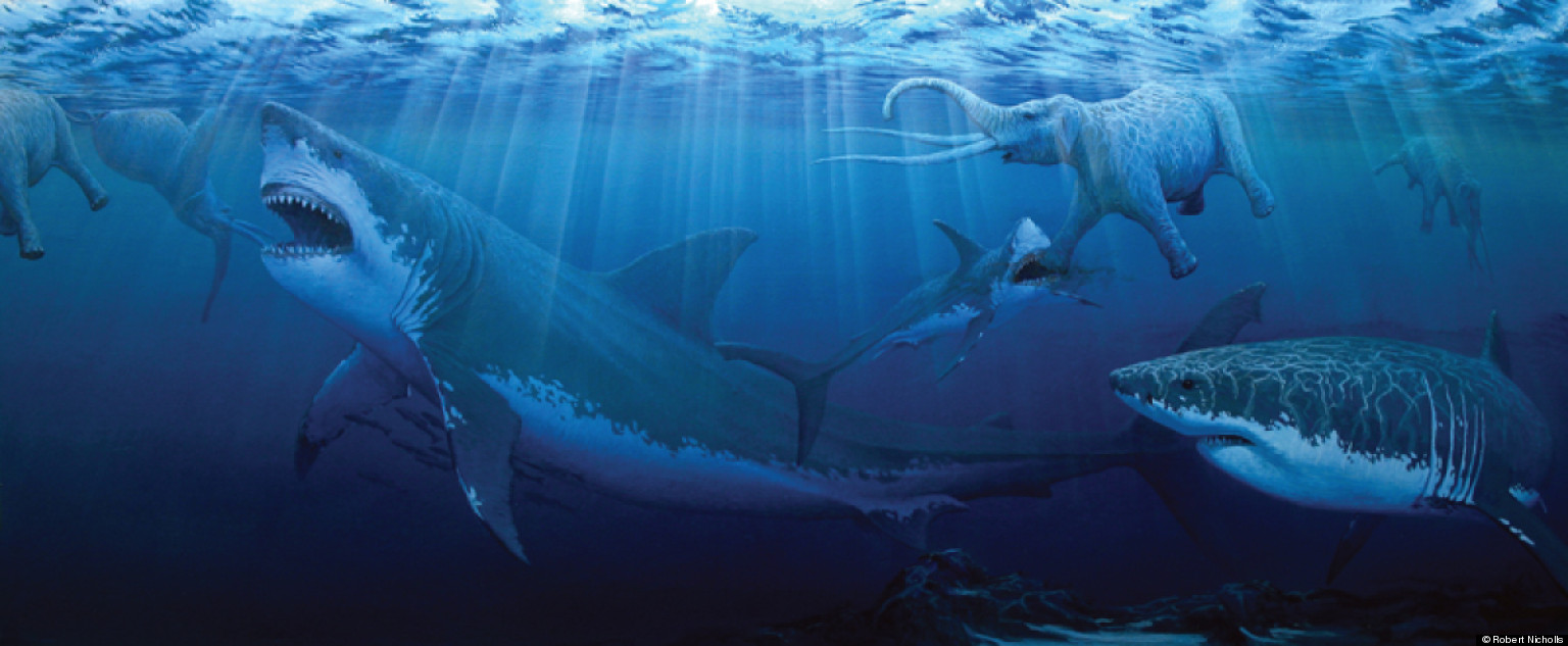 Питание и образ жизниМегалодон обитал в морях почти по всему миру, но предпочитал тёплую среду. Судя по всему, хищник пользовался достаточно схожими с современными белыми акулами моделями поведения. Однако имелись и весомые различия, диктуемые уникальным строением тела и колоссальными размерами. Мегалодон был ярко выраженным одиночным хищником, хотя вполне мог терпеть других особей в непосредственной близости от себя. В случаях нападения на очень крупных китов коллективная атака была взаимовыгодна.В отличие от современной родственницы у взрослого мегалодона почти не было ограничений в спектре потенциальных целей. Мегалодон мог нападать в одиночку как на стаи небольших рыб, так и на очень крупных китов. Это позволило стать настоящей грозой океанов, морским подобием тираннозавра. Сверххищником на протяжении достаточно длительного хронологического интервала. При этом стратегии атаки для каждого типа животных у мегалодона были различны, что наблюдается и у акул наших дней. ![]() Необычная иллюстрация английского палеохудожника Роберта Николса. Стадо ананкусов (Anancus) было унесено в море внезапно пришедшим на спокойные морские берега цунами. Их мёртвые тела некоторое время дрейфовали, пока распространяющийся запах не привлек внимание огромных древних акул. Пара взрослых мегалодонов и один детёныш воспользовались случаем, нисколько не гнушаясь привкуса разложения. ![]() А здесь уже живой платибелодон (Platybelodon) атакован на мелководье. Иногда молодые мегалодоны могли охотиться в шельфовых морях и, более того, подплывать совсем близко к берегу. Автор: канадский палеохудожник Джулиус Чотоньи. Отметим, что суммарная мощность арсенала не сопоставима с аналогами современниц. Более того, даже зубы были несколько более прочными, чем у последних: толще и шире, с массивным основанием. ![]() Сравнение зубов мегалодона (слева) и большой белой акулы (справа) в одинаковом масштабе от Prehistoric Wildlife. Они были приспособлены к высоким нагрузкам, появляющихся в процессе охоты на прекрасно защищённых животных. Как показывают окаменелости, мегалодон старался нанести критические травмы оным, атакуя важные органы и двигательный аппарат. Сила укуса была настолько велика, что раскалывались даже кости. И это были не только многометровые толстокожие киты (от семейств кашалотовых и гладких китов до дельфинов), но и гигантские морские черепахи. ![]() 3D-сцена нападения мегалодона на морскую черепаху из сериала "Неделя акул: Шаркзилла", выпущенного каналом Discovery. Среди других потенциальных жертв числятся китообразные меньших размеров, а также ластоногие и сирены. ![]() Очень крупный мегалодон гонится за млекопитающим из отряда сирен – дюгонем (Dugong). Автор: канадская художница Мари-Элен Амель. Одобеноцетопсы (Odobenocetops) и бригмофизетеры (Brygmophyseter), фигурирующие в документальных фильмах, теоретически также могли быть целями. И это далеко не полный спектр морских животных. Так как мегалодон существовал много миллионов лет, он успел повстречать и пережить не одно эволюционное поколение морских обитателей. С большой вероятностью мегалодоны поедали также и представителей других акул. Важно сказать также, что рацион совсем юных особей значительно отличался от рациона взрослых: доля мелкой рыбы и моллюсков в нём была существенно выше. ВидеоОтрывок из документального ф