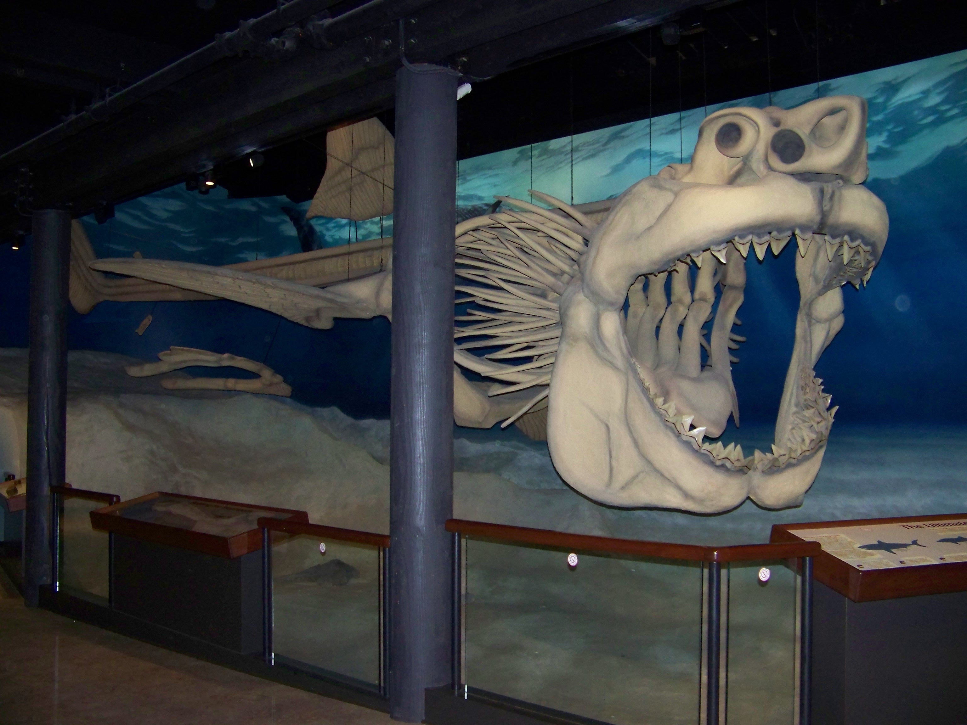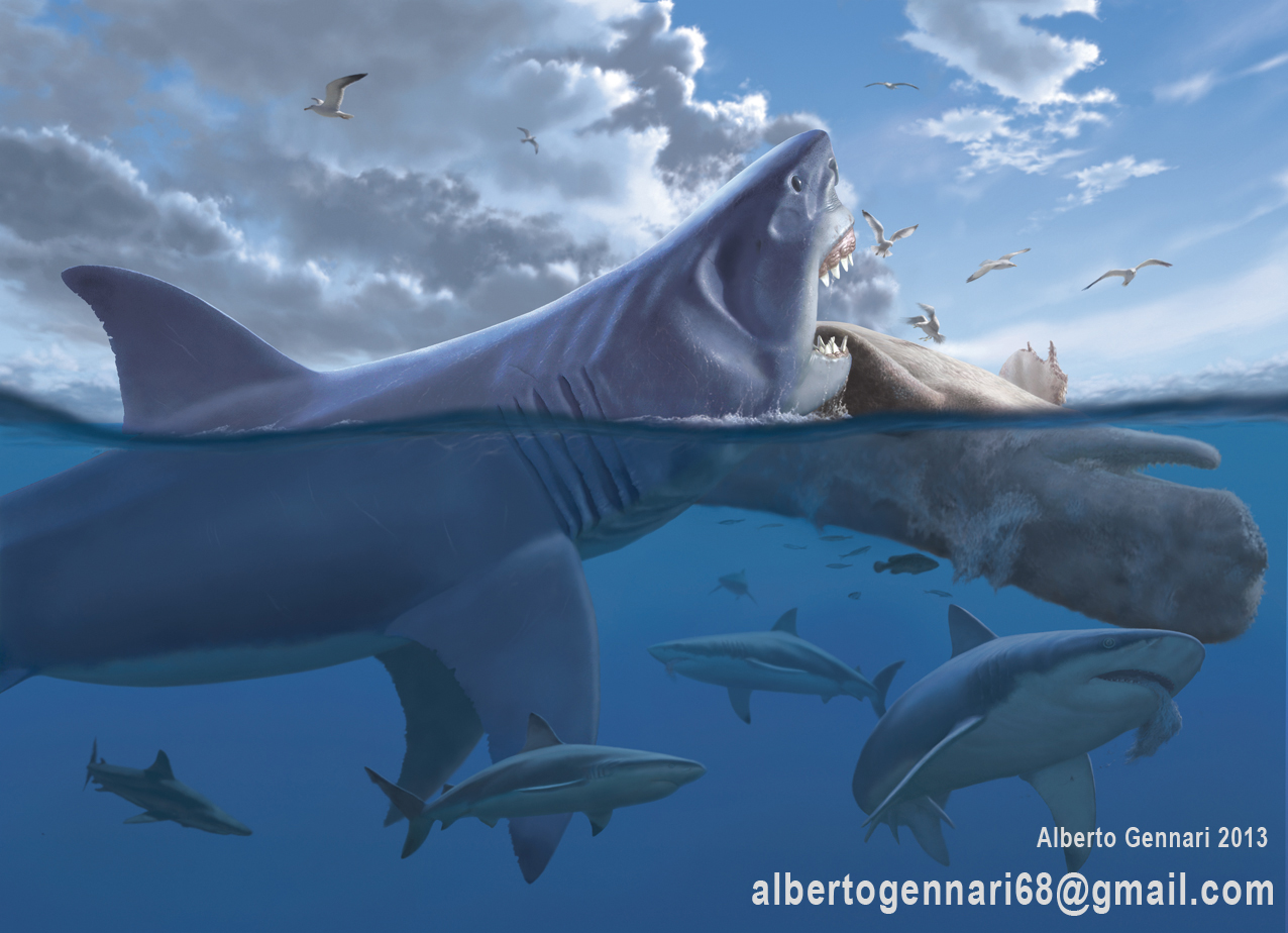 Время и место существованияСуществовали мегалодоны с конца олигоцена до начала плейстоцена, около 28,1 – 1,5 миллиона лет назад (с рюпельского по начало калабрийского яруса). Были очень широко распространены: остатки встречаются почти на всех континентах, за исключением Антарктики. Окаменелые зубы были обнаружены также в значительном удалении от суши, например в Марианском жёлобе в Тихом океане.![]() Насыщенная картина итальянского палеохудожника Альберто Дженнари: мегалодон приступает к поеданию кита. Рядом кружат непоседливые чайки, а в глубине собрались более мелкие акулы, готовые урвать кусок при любом удобном случае. Виды и история обнаруженияДлительное время вымершую рыбу считали родственницей белой акулы и причисляли к роду Carcharodon (в таком случае латинское название вида — Carcharodon megalodon), однако последние исследования говорят о принадлежности к роду Carcharocles (в этом случае название — Carcharocles megalodon). На текущий момент полной определённости в данном вопросе нет ввиду отсутствия достаточного материала.![]() На динамичной картине канадского художника Эндрю Домачовски мегалодон с открытой пастью буквально врывается в живое скопление. По всем признакам ископаемые остатки мегалодона и других доисторических акул люди находили ещё с первобытных времён. Однако первое достаточно ясные упоминания в литературе относятся к эпохе Возрождения: описываются находки огромных треугольных зубов, извлечённых из скальных пород. Естественно, в те времена этим впечатляющим артефактам легко приписывались мифические и даже мистические свойства. Говорилось, что это реальные подтверждения существования ужасных драконов и гигантских змей – их окаменевшие языки. Появилось даже общее название – глоссопетры (латинское слово glossopetrae происходит от древнегреческого словосочетания "каменные языки"). Однако уже тогда имелись учёные, прекрасно знакомые с анатомией акул. В 1667 году датский анатом и геолог Нильс Стенсен опубликовывает работу "Elementorum myologiæ specimen, seu musculi descriptio geometrica : cui accedunt Canis Carchariæ dissectum caput, et dissectus piscis ex Canum genere", в которой подмечает необычайное сходство глоссопетр с зубами крупной акулы, пойманной недалеко от портового города Ливорно (Италия) годом ранее. ![]() Представлена его знаменитая иллюстрация из трактата, где мы видим предполагаемую голову мегалодона на базе зубов. Она и сейчас фигурирует во многих книгах по истории палеонтологии как одно из первых палеонтологических открытий. Однако научное описание было мегалодону только спустя двести лет. В 1835 швейцарский естествоиспытатель Жан Луи Агассис, пользуясь накопленными к 19 веку знаниями по акулам, присваивает хозяину громадных ископаемых зубов имя Carcharodon megalodon. Это происходит в рамках книги "Recherches Sur Les Poissons Fossiles", которая была полностью завершена в 1843 году. ![]() Турецкий иллюстратор Керем Бейит показывает нам нападение на стаю кашалотов из глубины. В начале статьи мы объяснили видовое название мегалодона. Латинское же название рода, Carcharocles, происходит от пары древнегреческих слов "славный зуб" (Carcharodon — "акулий зуб").[2] С тех пор в разных частях света было найдено огромное количество окаменелых зубов мегалодона разной величины. Часть из них поступила на хранение в музеи, а другая пребывает в частных коллекциях. Строение телаДлина тела мегалодона достигала 16 метров. Высота же до 4,5 метр