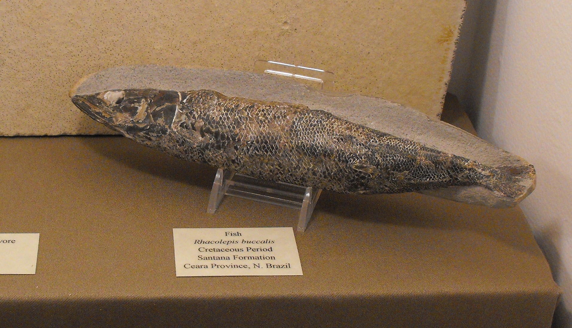 Питание и образ жизниРаколепис обитал в неглубоких тёплых морях, характерных для раннемеловой формации Сантана. Считается одной из самых распространённых здешних рыб и часто находится в превосходной сохранности.Без каких-либо сомнений, раколепис вёл хищный образ жизни. Но охотился он преимущественно на донных десятиногих раков и прочих беспозвоночных, а также мелкую рыбёшку и мальков. ![]() Окаменелости с ярмарки округа Сан-Диего (штат Калифорния, США). У небольшого раннемелового организма, не обладающего специальными защитными приспособлениями, была масса естественных врагов. Скорее всего, раколепис входил в рацион многих животных. В первую очередь к ним можно зачислить процветающих птерозавров (например, тропеогната (Tropeognathus) или арарипедактиля (Araripedactylus)) и крупную рыбу. Лишь бдительность и изворотливость могла спасти раколеписа от их зубов. Гипотетически, мог иногда он попадать и в острые зубы динозавров. В частности, здесь был обнаружен рыбоядный гигант ирритатор (Irritator). Соседствующие крокодилы
