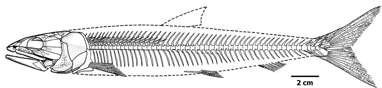 Время и место существованияСуществовали раколеписы в начале мелового периода, около 113 – 100,5 миллиона лет назад (альбский ярус). Были распространены на территории современной Бразилии.![]() Реконструкция внешнего облика раколеписа из работы Джона Мэйси и Марии Карвалью ("First records of fossil sergestid decapods and fossil brachyuran crab larvae (Arthropoda, Crustacea): with remarks on some supposed palaemonid fossils, from the Santana Formation (Aptian-Albian, NE Brazil)", 1995 год). Рядом изображена основная пища – мелкие ракообразные. Виды и история обнаруженияНыне общепризнан единственный вид – Rhacolepis buccalis, соответственно являющийся типовым. Ископаемые остатки были обнаружены на северо-востоке Бразилии. Породы относятся к раннемеловой формации Сантана, входящую в более крупное образование – Бассейн Арарипе.![]() На карте показано место обнаружения доисторической лучепёрой рыбы. Описание раколепису в 1841 году дал швейцарский естествоиспытатель Жан Луи Агассис. В начале статьи мы объяснили родовое название раколеписа. Видовое имя buccalis переводится с латинского как "щёчный". Строение телаДлина тела раколеписа достигала 25 см. Высота же до 6 см. Весил он до 350 граммов.![]() Характеризуется обтекаемым веретенообразным телом и заострённым рылом. Обладал достаточно большим ртом и острыми зубами, необходимыми для регулярной охоты. Скелет раколеписаНа фото представлен экспонат вида Rhacolepis buccalis из музея Натуралис (г. Лейден, Нидерланды).![]() Ниже графическая реконструкция скелета из работы американского палеонтолога Глории Арратии ("The varasichthyid and other crossognathiform fishes, and the Break-up of Pangaea", 2008 год).