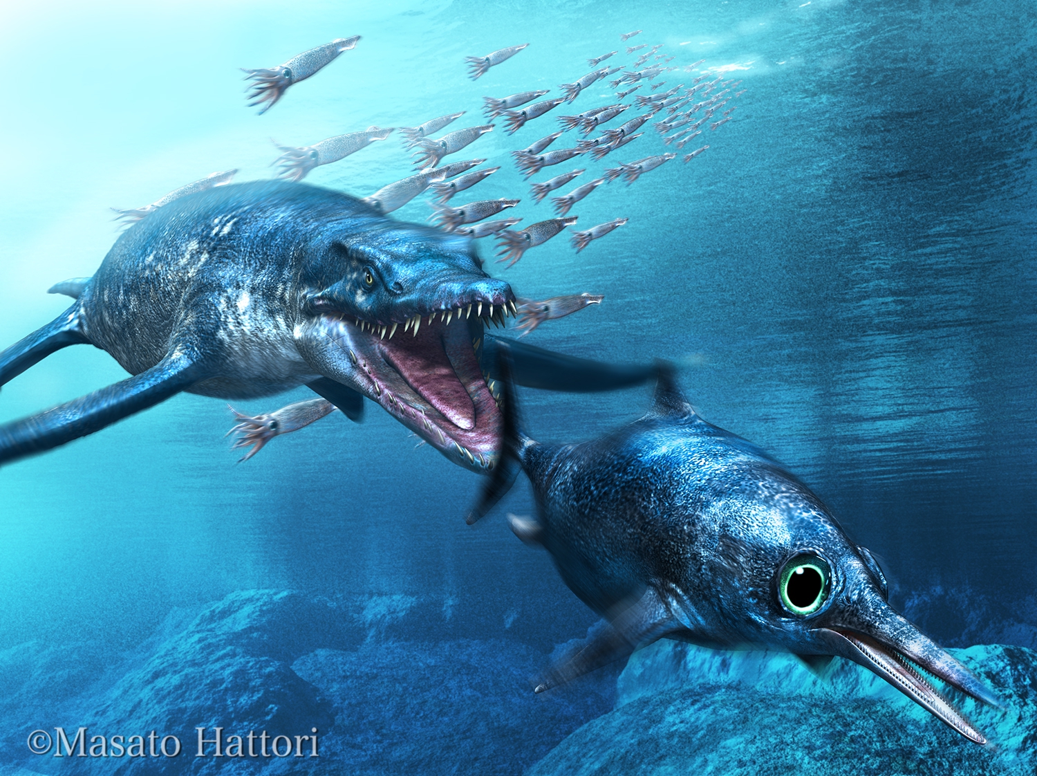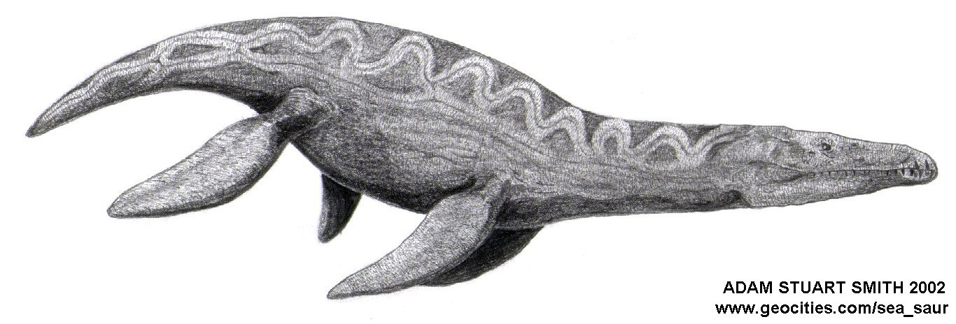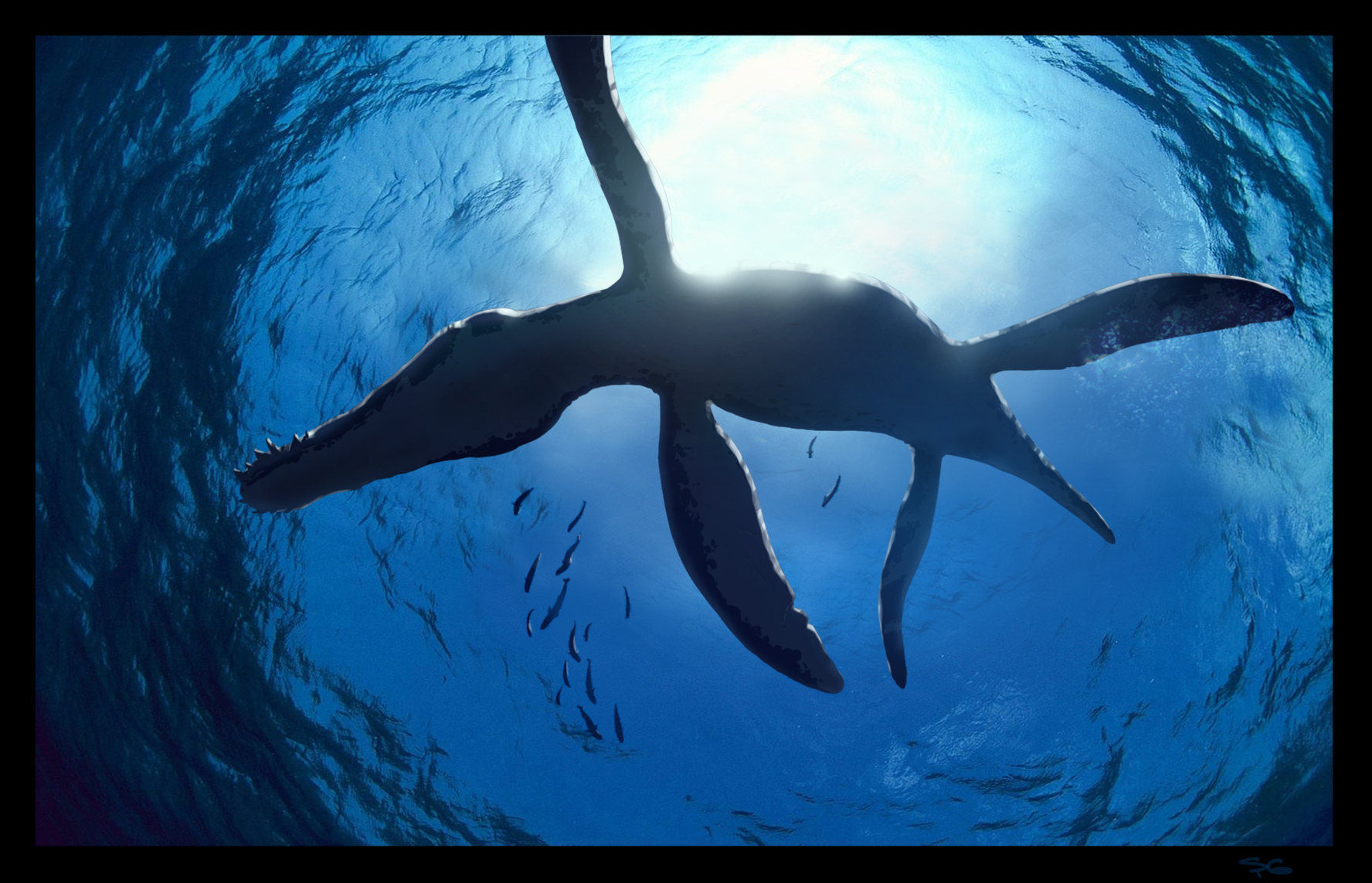 Питание и образ жизниПо ряду признаков лиоплевродон был верховным морским хищником своей эпохи. Лишь в некоторых локациях с ним могли конкурировать другие плиозавры сопоставимых или даже больших размеров, такие как грозный симолест (Simolestes). Возможно, лиоплевродон одинаково комфортно чувствовал себя как на глубоководье, так и в тёплых мелких морях тогдашней Европы.В пищу лиоплевродон мог употреблять всевозможную рыбу (к примеру, примитивных лучепёрых лепидотов (Lepidotes)), головоногих моллюсков, а также других доисторических ящеров. Легко могли подвергаться нападению ихтиозавры офтальмозавры (Ophthalmosaurus) и менее вооружённые плезиозавры, например криптоклиды (Cryptoclidus), пелоневсты или муренозавры (Muraenosaurus). ![]() Трёхмерная сцена от итальянского дизайнера Ивана Сталио. Лиоплевродоны набрасываются на стаю небольших ихтиозавров. Кроме того, здесь водились и другие потенциальные цели – мезозойские крокодиломорфы. Ведь в мягких водах нашли прибежище и пищу узкомордые талаттозухии метриоринхи (Metriorhynchus) и стенеозавры (Steneosaurus). Гипотетически юрские плиозавры могли охотиться даже на гигантских лидсихтисов (Leedsichthys) (особенно если допустить нападение на крупную жертву парами или более многочисленными группами), хотя вряд ли они составляли основу их рациона. ![]() Лиоплевродон-самец в исполнении дуэта французских 3D-дизайнеров Марка Буле и Сильвии Лоррен. Мощные ласты и обтекаемое тело позволяли быстро набрать скорость, а длинные сильные челюсти с острыми зубами были способны преодолеть даже прочную чешую. Возможно, лиоплевродоны и аналогичные плиозавры были по своему мастерами засадной техники. С помощью чувствительных ноздрей они могли улавливать запахи приближающихся животных. ВидеоОтрывок из документального фильма "Прогулки с динозаврами". Лиоплевродон набрасывается на эвстрептоспондила (Eustreptospondylus), неосторожно вышедшего на отмель.Фрагмент художественно-документального фильма "Прогулки с морскими чудовищами". Наблюдение за плезиозавром в родной среде обитания. Отрывки из фантастического сериала "Портал юрского периода", где задействован и лиоплевродон. Юрские динозавры Англии и ФранцииГалерея рисунковЩелкните на интересующую миниатюру для увеличения. Снизу указан художник.