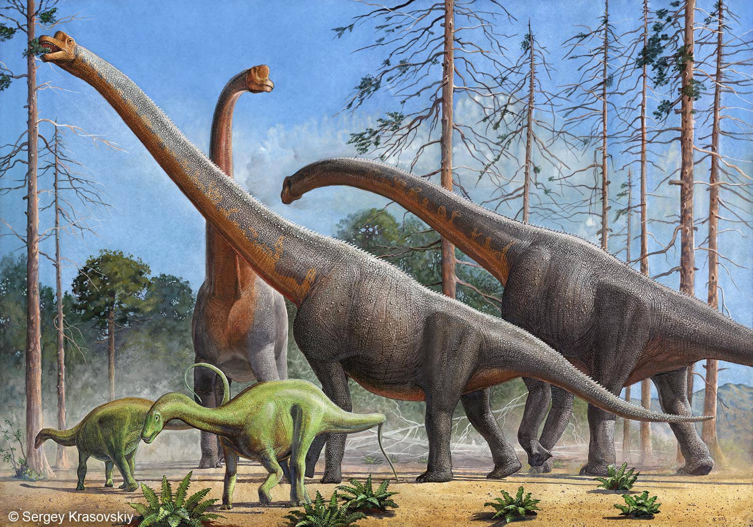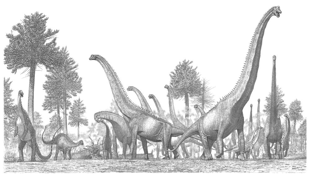 Питание и образ жизниУчитывая массу родов травоядных динозавров, проживающих бок о бок, формация Тендагуру в конце юры буквально изобиловала растительностью. Пока относительно небольшие кентрозавры ощипывали низкорослую растительность, высоченные жираффатитаны объедали кроны деревьев. Стадам дикреозавров же мог доставаться средний сегмент. Кстати сказать, аналогичную благодатную картину в тот же период времени мы наблюдаем в Северной Америке, только уже со стегозаврами и брахиозаврами.Жираффатитаны ели очень много, поэтому им приходилось постоянно перемещаться с одного оскудевшего пастбища на другое. Удивительно, но мы не видим в Южной Африке то количество хищников, какое имеет место в Северной Америке. С большой вероятностью находки ещё впереди. Пока же единственным крупным тероподом точно попадающим в этот временной интервал является ветерупристизавр. Группами ветерупристизавры вполне могли охотиться на юных жираффатитанов, неосмотрительно вышедших из под опеки взрослых. ![]() Рисунок Грегори Пола открывает перед нами пасущееся стадо жираффатитанов. Слева им аккомпанируют дикреозавры, встающие на задние ноги. ![]() Аналогичная сцена на красочной картине палеохудожника Сергея Красовского. Растительноядные соседиБлизкие родаАвтор статьи: ArgusEye |