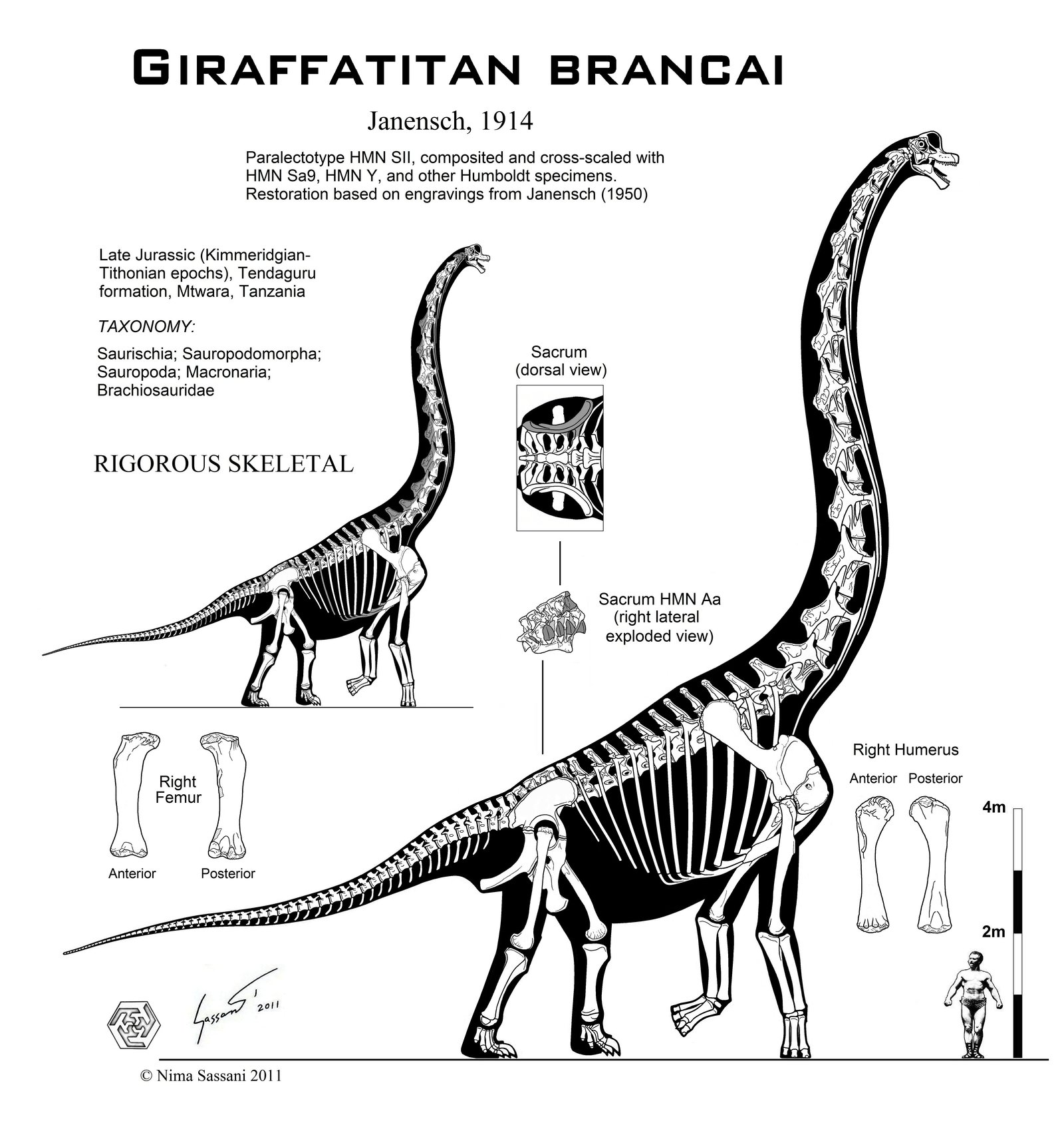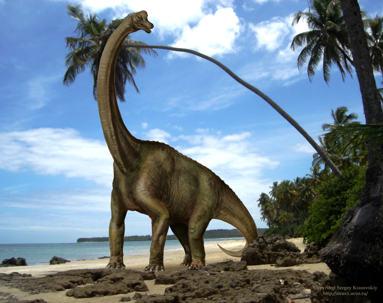 Время и место существованияСуществовали жираффатитаны в конце юрского периода, около 150 – 145 миллионов лет назад (титонский ярус). Были распространены на территории современной Танзании.![]() У Дмитрия Богданова жираффатитан отличается яркой окраской. Виды и история обнаруженияНыне известен единственный вид – Giraffatitan brancai, соответственно являющийся типовым.Впервые жираффатитан обнаружен в ходе масштабной немецкой экспедиции под предводительством немецких палеонтологов Вернера Яненша и Эдвина Хеннига. С 1909 по 1912 год они вели раскопки в формации Тендагуру, расположенной близ городка Линди (Танзания). В 1914 году Яненш причисляет образцы нескольких особей к новому виду брахиозавра – Brachiosaurus brancai. И только в 1988 американский реконструктор Грегори Пол впервые отмечает, что американский брахиозавр имеет явные отличия от своего африканского собрата. Отметим, что на тот момент большинство описаний брахиозавра базировались именно на последнем ввиду полноты находки. Более того, он служил моделью почти всех реконструкций и рисунков, которые вы можете встретить в ранней литературе. Пол отметил иные пропорции позвонков и в целом более изящное строение будущего жираффатитана. Поэтому он выделил его в подрод Brachiosaurus (Giraffatitan) brancai. В 1991 палеонтолог Джордж Ольшевски принял эти аргументы и наконец выделяет его просто в отдельный род – жираффатитан (Giraffatitan). Однако идея не получила широкого признания в научном сообществе, и история получила новое развитие. В 1998 году американский палеонтолог Кеннет Карпентер подробно описал череп, который был найден почти сотню лет назад и использовался ещё Чарльзом Маршем в его ранних реконструкциях бронтозавра (ныне апатозавра). По результатам выкладок оказывается, что череп принадлежит брахиозавру (возможно виду Brachiosaurus altithorax), поэтому он временно обозначается как Brachiosaurus sp. Отмечается, что структура больше напоминает камаразавра, чем бронтозавра. Главным же отличием американского экземпляра от африканского является более удлинённая морда и менее высокий гребень (холмообразная верхняя часть черепа с широкими окнами). Вы можете самостоятельно сравнить череп жираффатитана с черепом брахиозавра на сайте. Также Карпентером найдены отличия в форме передних зубов. Точка же была поставлена, когда в 2009 году британским палеонтологом Майклом Тейлором было проведено строгое сравнение двух видов. Он показал, что почти каждая кость Brachiosaurus brancai отличается от Brachiosaurus altithorax не только размером, но также формой и пропорциями. Таким образом, наконец утверждается самостоятельный род – жираффатитан. Строение телаДлина тела жираффатитана достигала 22,5 метров. Высота же до 13,27 метров. Весил он до 31,5 тонн.![]() Обладал немного более лёгким телосложением, чем родственный брахиозавр. Передвигался жираффатитан на четырёх колоннообразных ногах. Передние ноги были гораздо длиннее и массивнее задних, так как колоссальная нагрузка приходилась именно на переднюю часть тела. Могучие плечи жираффатитана располагались на высоте около 6 метров. Благодаря им и необыкновенной шее голова находилась аж на тринадцатиметровой высоте над уровнем земли. Для сравнения высота африканского жирафа всего до 6 метров. Относительно размеров тела голова была весьма небольшой. Череп у жираффатитана объёмный с большим количество широких отвер
