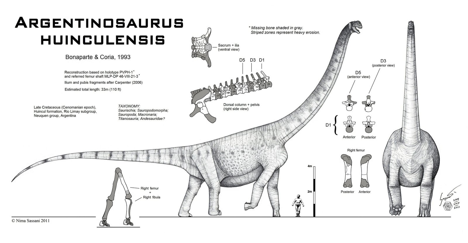 Время и место существованияСуществовали аргентинозавры в конце мелового периода, около 97 – 94 миллиона лет назад (первая половина сеноманского яруса). Были распространены на территории современной Аргентины (провинция Неукен).![]() На композиции Сергея Красовского группа голодных мапузавров рискнула напасть на стадо аргентинозавров. Находясь в опасной близости от взрослых, они явно стараются достать детёныша. Но родители бдительны и в любой момент могут нанести сокрушительный удар. Виды и история обнаруженияНыне общепризнан единственный вид – Argentinosaurus huinculensis, соответственно являющийся типовым.Первые останки аргентинозавра были обнаружены фермером Гильермо Эредиа в конце 1980-х на территории обыкновенного фермерского хозяйства "Las Overas", расположенного в 8 километрах от небольшого городка Пласа-Уинкуль (провинция Неукен, Аргентина). Ныне это территория формации Уинкуль, входящая в более крупное образование Лимай. Человек сообщил о находке сотрудникам муниципального Музея Кармен Фунес, и ими из земли была извлечена голень аргентинозавра. Затем она была выставлена в этом же музее. Летом 1989 комиссия Аргентинского Музея Естественных Наук под руководством Хосе Фернандо Бонапарте произвела добычу ископаемого материала в рамках полевых работ, финансируемых Национальным Географическим Обществом. Описание вида было опубликовано знаменитыми аргентинскими палеонтологами Хосе Фернандо Бонапарте и Родольфо Кориа в 1993 году. Экземпляр голотипа получил идентификационный номер MCF PVPH-1. Помимо него аргентинозавру принадлежит неполный образец бедренной кости MLP-DP 46-VIII-21-3. ![]() Альтернативная реконструкция аргентинозавра с вертикально поднятой шеей от американского палеохудожника Нимы Сассани. В начале статьи мы объяснили название аргентинозавра, имя же вида huinculensis переводится с латыни как "уинкульский". Как вы можете легко догадаться, оно дано в честь места обнаружения – формации Уинкуль. К сожалению, останки аргентинозавра весьма скудны, поэтому мы с нетерпением ждём новых находок для детального восстановления облика. Строение телаДлина тела аргентинозавра достигала 30 метров.[1][2] Высота же до 13 метров. Весил он до 72,936 тонны.[3]![]() Показательное сравнение с тираннозавром, слоном и конечно же, человеком. На текущий момент занимает третье место по длине среди всех динозавров. Также является одним из самых тяжёлых ужасных ящеров. Передвигался аргентинозавр на четырёх мощных конечностях, причём в отличие от диплодоцид передние ноги практически не уступали задним в длине. Окружность бедренной кости доходила до 1,18 метра, а длина большой берцовой кости до 1,55 м. Учитывая размеры динозавра, средняя скорость передвижения была невысокой. Однако черепашьим шагом (качество, ошибочно приписывающееся крупным зауроподам) аргентинозавр не обладал: колоссальная мускулатура позволяла сохранять относительную мобильность. Ведь многочисленным стадам необходимо было постоянно перемещаться от оскудевших пастбищ к девственным. В документальных фильмах аргентинозавров часто показывают легко и непринуждённо встающими на две ноги, однако учитывая предположительный размер передних ног и вообще объёмы фронтальной части тела, это крайне маловероятно. Имеет место совершенно иной баланс, чем у диплодоцид, таких как бронтозавр. Небольшая (относитель