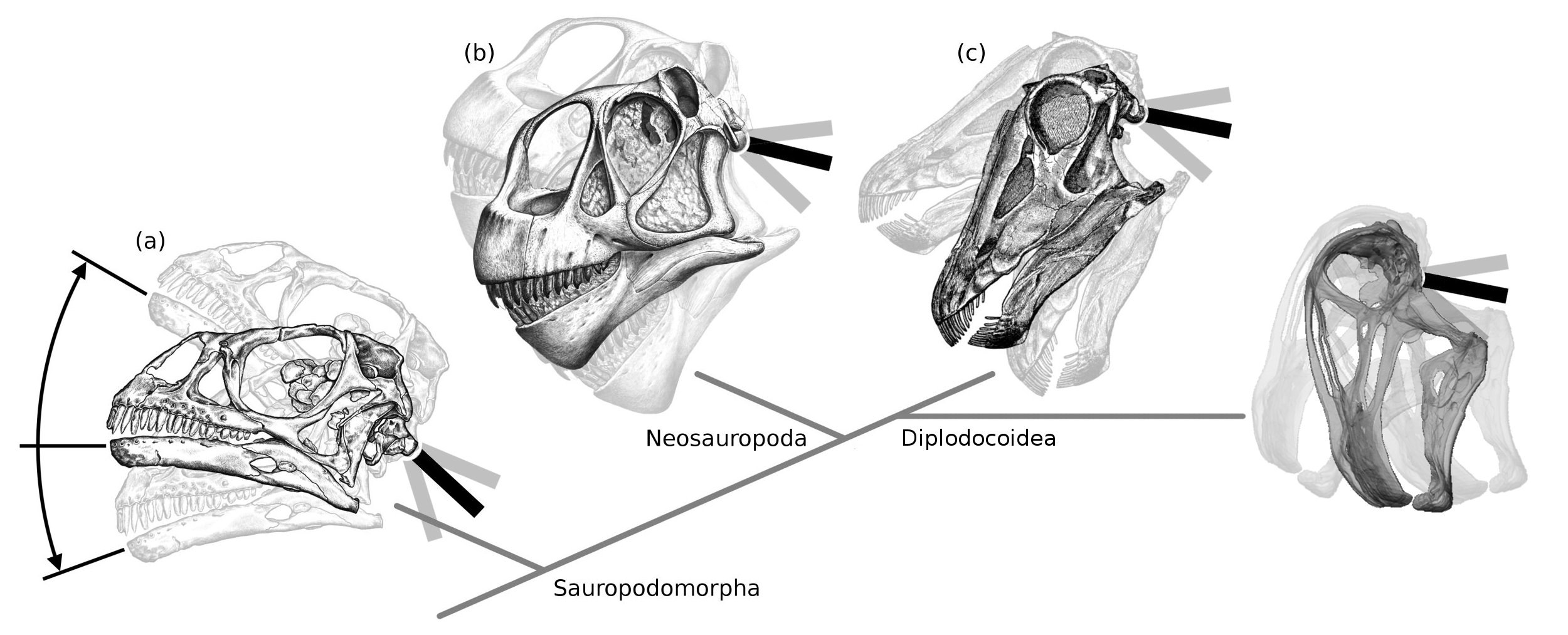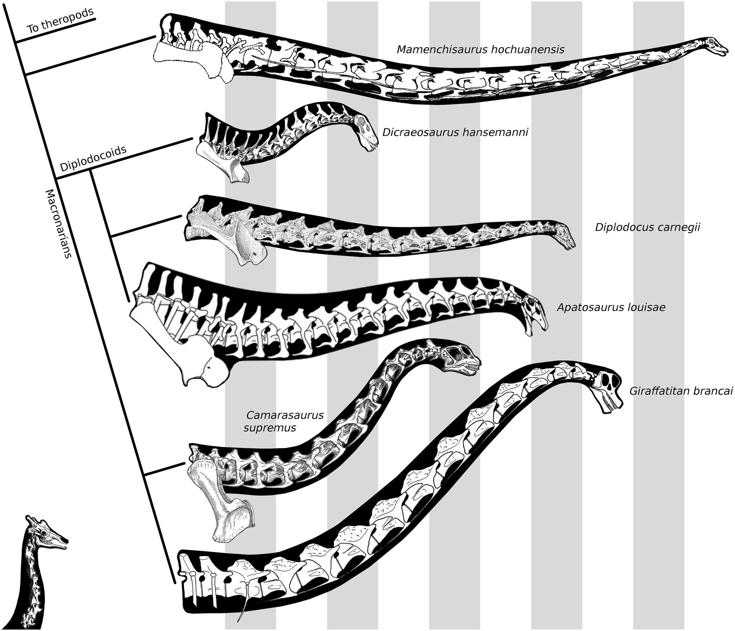 Время и место существованияСуществовали зауроподы с позднего триасового по конец мелового периода, 231,4 – 66 миллионов лет назад (с середины карнийского по маастрихтский ярус). Были очень широко распространены: остатки встречаются на всех континентах.![]() Превосходная компиляция из нескольких родов (щёлкните для увеличения), выполненная испанским палеохудожником Раулем Мартином. Оформление: Джен Кристиансен. Названия указаны под динозаврами. Определения и история обнаруженияЗауроподы (Sauropoda) – отряд динозавров, характеризующихся длинными шеями и хвостами, небольшими черепами, а также рядом других морфологических признаков, которые иллюстративно будут приведены ниже. В других классификациях идёт как подотряд зауроподоморфов (Sauropodomorpha).Латинское название Sauropoda происходит от пары древнегреческих слов "нога ящера" и характеризует строение конечностей. Его автором является знаменитый британский палеонтолог Чарльз Марш. Он предложил название в 1978 году в научной работе "Principal characters of American Jurassic dinosaurs. Part I". ![]() Несколько высоких представителей в исполнении российского художника Дмитрия Богданова. Скорее всего, в античные и средние века остатки зауроподов находили по всему миру достаточно часто. Но первые идентифицируемые остатки, упоминаемые в литературе, появляются лишь в 1699 году. Это работа валлийского учёного Эдварда Ллуйда "Lithophylacii Britannici Ichnographia, sive lapidium aliorumque fossilium Britannicorum singulari figura insignium". Животное, известное по одному зубу, получило от него имя Rutellum implicatum. Первые же описанные ископаемые остатки зауроподов были обнаружены в начале 19 века в Великобритании: упоминание о них датируется 3 июнем 1825 года. Это был спинной позвонок и элементы конечностей цетиозавра (Cetiosaurus). В 1841 году его описал Чарльз Марш. Тогда же был описан и второй зауропод – кардиодон (Cardiodon). С тех пор было сделано множество открытий. На сегодняшний день известно около сотни родов зауроподов и с каждым годом их число неуклонно растёт. Строение телаДлина тела зауроподов достигала 37 метров (патаготитан). Высота же до 17 метров (завропосейдон). Весили они до 73 тонн (аргентинозавр). Это крупнейшие динозавры и наземные животные за всю историю планеты вообще.![]() Несколько крупных зауроподов для сравнения помещено американским палеохудожником Скоттом Хартманом на одну платформу. Не правда ли, размеры впечатляют? Рекордсмен длины, суперзавр (Supersaurus), идёт под буквой E. Но далеко не все они были такими огромными. Вариативность размеров велика. Ранние представители, такие как анхизавр (Anchisaurus), весили всего около 27 килограммов при длине 2,4 м. Были среди них ящеры даже меньше, например панфагия (Panphagia). Передвигались зауроподы преимущественно на четырёх ногах, однако ранние формы могли легко ходить и на двух. Самые маленькие зауроподы были достаточно мобильными и могли спасаться от врагов бегством. Крупные же были медлительными, а при защите уже уверенно полагались на свои размеры и вооружение. Головы относительно тела были небольшими. ![]() На иллюстрации из статьи Майкла Тейлора и коллег ("Head and neck posture in sauropod dinosaurs inferred from extant animals", 2009 год) показана вариативность черепов и приблизительный угол поворота относительно шеи (кликните для увеличения). Модификация: Мэтью Ведель. Рода слева направо: массоспондил (Massospondylus), камаразавр (Camarasaurus), диплодок (Diplodocus) и нигерзавр (Nigersaurus). Зубы тоже
