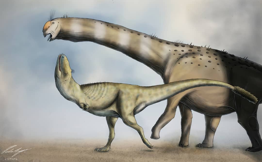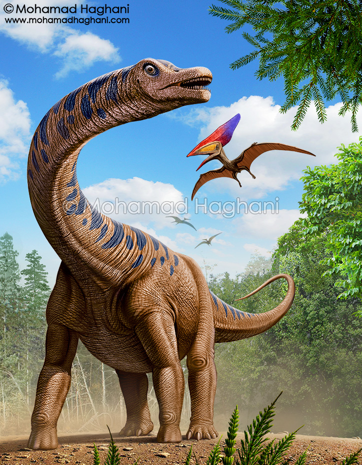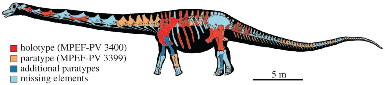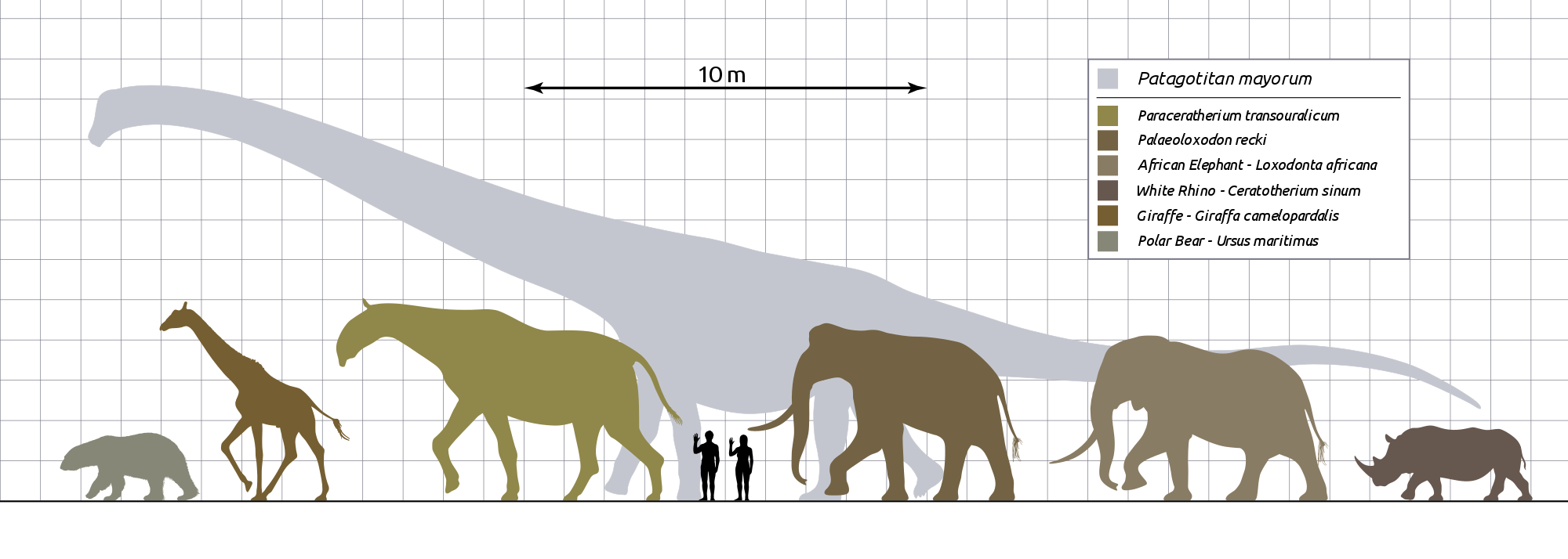 Время и место существованияСуществовали патаготитаны в начале мелового периода мезозойской эры, около 101,8 – 101,44 миллиона лет назад (верх альбского яруса). Были распространены на территории современной Аргентины, в провинции Чубут (Патагония).[1]![]() Внушительный ящер в исполнении аргентинского художника Габриэля Лио. Виды и история обнаруженияНыне известен один вид – Patagotitan mayorum, соответственно являющийся типовым.Впервые ископаемые остатки патаготитана, часть бедренной кости, были обнаружены простым сельским пеоном, Аурелио Эрнандесом, в 2010 году в пустынной местности на эстансии (аналог североамериканского ранчо) "Ла Флеча" (приблизительно 260 км от города Трелью, провинция Чубут, Аргентина). Породы относятся к стратиграфической формации Серро Барсино (поздний альб).[1] ![]() На картине иранского палеохудожника Мохамада Хагани яркий бразильский талассодромей (Thalassodromeus) беззаботно пролетает мимо шеи патаготитана. После оповещения через несколько лет на место выдвинулась исследовательская команда Палеонтологического музея Эгидио Феруглио, расположенного в Трелью. Раскопки продолжались с 2013 по 2015 год. Информация о находке гиганта впервые была широко распространена СМИ в 2014 году, а в январе 2016-го, ещё до описания, даже вышла британская документальная кинокартина "Аттенборо и гигантский динозавр". Собранные окаменелости хранятся в музее Палеонтологического музея Эгидио Феруглио. Описал патаготитана в 2017 году следующий коллектив палеонтологов: Хосе Луис Карбальидо, Диего Пол, Алехандро Отеро, Игнасио Алехандро Серда, Леонардо Сальгадо, Альберто Карлос Гарридо, Джахандар Рамезани, Нестор Рубен Кунео и Хавьер Марсело Краузе. Рамезани единственный представляет университет из США, все остальные учёные из Аргентины. В начале статьи мы объяснили родовое название колосса. Видовое имя "mayorum" дано в честь семьи Майо, хозяев эстансии "Ла Флеча".[1] ![]() Вариант внешнего облика, основанный на реконструированном скелете из описания. Автор — аргентинский иллюстратор Хорхе Гонсалес. Голотип патаготитана, частичный скелет без черепа, получил ярлык MPEF-PV 3400. Также стоит выделить экземпляр MPEF-PV 3399, второй частичный скелет. Собственно, они и послужили основой реконструкции, которая будет представлена в следующем разделе. Помимо них известны следующие образцы патаготитанов: MPEF-PV 3372, MPEF-PV 3375, MPEF-PV 3391, MPEF-PV 3392, MPEF-PV 3393, MPEF-PV 3394, MPEF-PV 3395, MPEF-PV 3396 и MPEF-PV 3397. Малая вариация размеров повторяющихся элементов и гистологические данные показывают, что все они были молодыми взрослыми животными.[1] Учитывая число и качество образцов патаготитана, материал считается одним из самых полных среди гигантских титанозавров. Об открытии колоссальной рептилии сообщают в National Geographic. Строение телаДлина патаготитана достигала 37 метров. Высота же приблизительно до 11 метров. Весил он до 69 тонн.[1] На текущий момент считается самым длинным динозавром за всю историю. Также входит в число самых тяжёлых ужасных ящеров.![]() Сравнение патаготитана и ряда крупнейших млекопитающих. Слева направо: белый медведь, жираф, парацератерий, палеолоксодон, саванный слон и белый носорог. Реализовал Стивен О'Коннор (Англия). ![]() Гигантская бедренная кость титана из Патагонии. Не правда ли, впечатляет? Передвигался аргентинский динозавр на четырёх колонноподобных ногах. Стоит заметить, что передние 