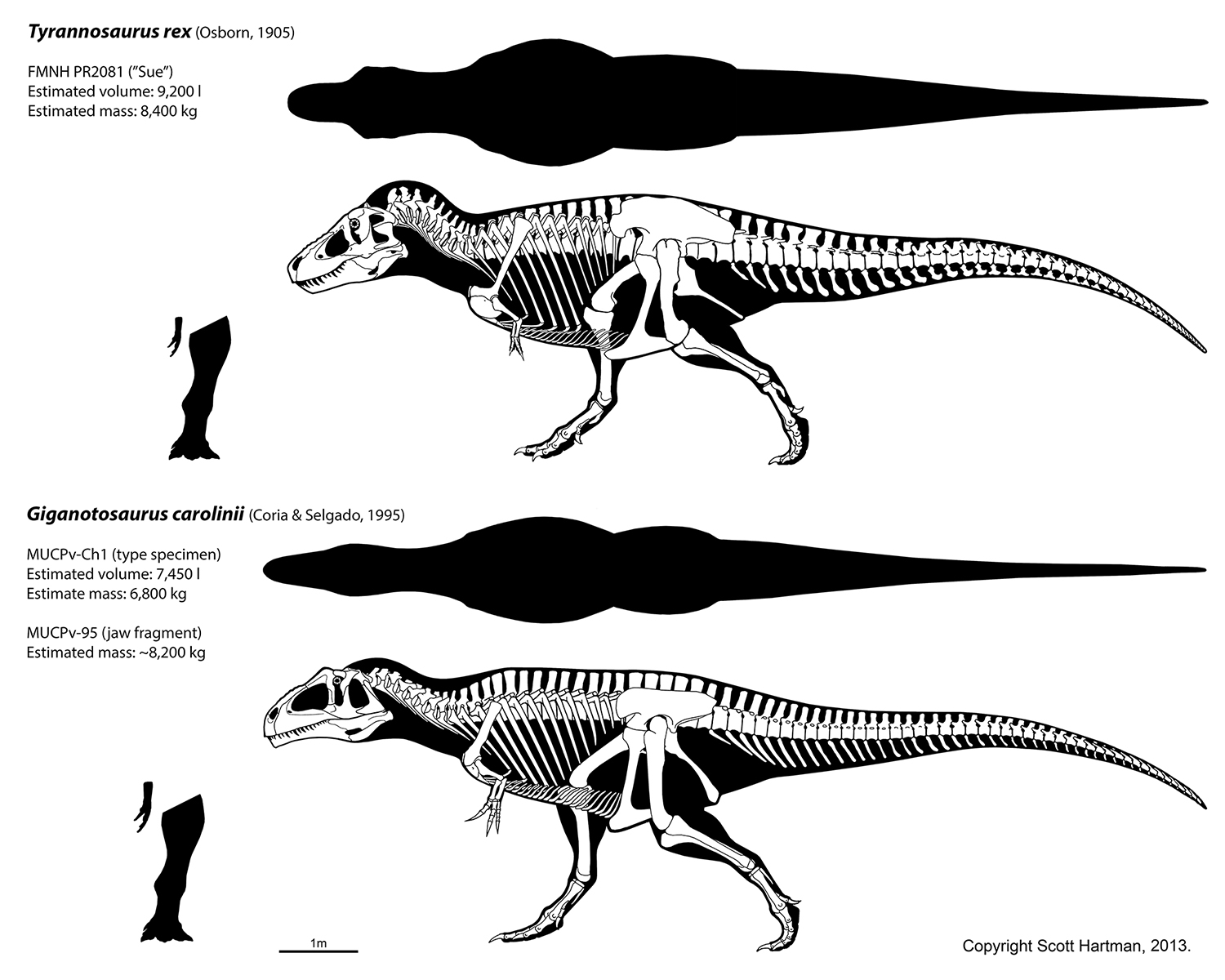 Как интересно вы выкрутились! Взяли фотографию скелета со старой реконструкцией черепа, просто подогнали изображения по масштабу, чтобы черепа гиганотозавра и тираннозавра примерно совпадали по размеру, - и всё, готово! Вы вообще понимаете, что череп гиганотозавра сохранился частично, и, меняя расположение отдельных костей, можно добиваться разных оценок длины черепа? И только так, а не брать скелет гиганотозавра и масштабировать его, добиваясь длины черепа, схожей с таковой у тираннозавра. Неудивительно, что гиганотозавр выглядит таким хрупким по сравнению с тираннозавром. Посмотрите на изображения Скотта Хартмана (https://vignette.wikia.nocookie.net/dinosaurs/images/3/30/North_vs_south_redux.jpg/revision/latest?cb=20131017023446) или поищите другие изображения в интернете и увидите, что картина совсем иная.