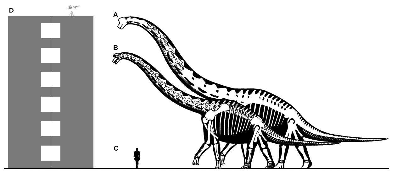 Пока определены пять позиций, но постепенно будем увеличивать их число. При этом рейтинг будет периодически обновляться. Как видим, первое место сейчас принадлежит раннемеловому завропосейдону. Это не только самый высокий динозавр в мире, но и самое высокое животное из известных науке вообще. Его рост приблизительно соответствует высоте пяти-шестиэтажного дома. Жираф, самое высокое животное наших дней, по сравнению с завропосейдоном показался бы лилипутом: рекордная высота африканского млекопитающего всего около 6 м, то есть меньше почти в три раза. Предлагаем посмотреть на титана со стороны (щёлкните для увеличения). ![]() Иллюстрация из работы американских палеонтологов Мэтью Веделя и Ричарда Сифели ("Sauroposeidon: Oklahoma's Native Giant", 2005 г). Небольшое дополнение выполнено нами. Здесь: A - завропосейдон, B - жираффатитан; C - человек; D - шестиэтажное здание. Далее фотография одного из фрагментов завропосейдона. ![]() Восьмой шейный позвонок плюс задняя часть седьмого. Рядом расположились Майкл Тейлор (слева) и Мэтью Ведель (справа). Чем можно охарактеризовать лидирующую группу динозавров? Как и в случае с длиной и высотой, все лидирующие позиции занимают зауроподы – длинношеие четвероногие колоссы, питающиеся растительной пищей. При этом особенно выделяется семейство брахиозаврид и их близкие родственники. Вплотную следуют титанозавриды. Важно заметить, что такая высота достигалась в первую очередь благодаря длинной шее. С её помощью зауроподы могли не только дотягиваться до ветвей, но и объедать растительность в значительном радиусе вокруг себя. Не делая при этом лишних шагов. Будет справедливо проиллюстрировать и других лидеров. ![]() Несколько гигантских зауроподов для сравнения помещено американским палеохудожником Скоттом Хартманом на одну платформу. Не правда ли, рост динозавров весьма впечатляет? Виды указаны справа. ![]() Следующим идёт огромный китайский дасятитан, расположившийся рядом с человеком. От испанского палеохудожника Асьера Ларраменди. Рекомендуем также почитатьАвтор статьи: ArgusEye