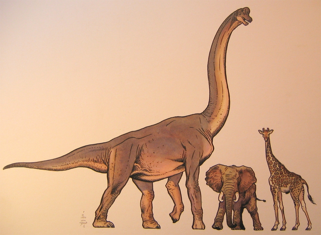 В скобках указано латинское название вида. Чтобы прочитать описание чемпионов, профили которых уже имеются в базе – кликните на название. Совсем недавно, в 2017 году описан аргентинский титанозавр патаготитан, превзошедший даже суперзавра, нашего предыдушего рекордсмена. ![]() Приближённое сравнение самого длинного динозавра, самолёта марки "Боинг", человека и африканского слона (иллюстрация с сайта USA Today). До него действительно продолжительное время (после очередных переоценок диплодока и футалогнкозавра[1]) лидировал суперзавр с 34 метрами. Для сравнения длина крупнейшего современного животного, голубого кита, по неофициальным оценкам всего до 33,6 м (максимальная же официальная оценка – 29,9 м). Но интересно сравнить животных визуально, поэтому на следующем изображении мы поставили их рядом: сверху скелет суперзавра из выставочного центра Макухари Мэссэ (г. Тиба, Япония), а снизу скелет голубого кита из Музея Естественной Истории Санта-Барбары (штат Калифорния, США). Щёлкните для увеличения. ![]() При этом подчеркнём, что, в отличие от динозавров, кит – это морское животное. Ещё одно сравнение, на сей раз графическое: голубой кит на фоне диплодока. ![]() Следом идёт аргентинозавр, "заметно констрастирующий" не только рядом с человеком, но и на фоне отнюдь не маленьких гиганотозавров. ![]() Эта показательная сцена воплощена индийским художником SameerPrehistorica. Далее предлагаем сравнение не менее известного брахиозавра с одними из самых больших сухопутных животных современности – слоном и жирафом. Не правда ли, разница впечатляет? ![]() Картина создана известным американским художником Уильямом Стаутом в 1990 г. Наверное очень интересно, чем же питались самые большие динозавры? Все они классические зауроподы – травоядные ящеры, передвигавшиеся на четырех ногах. Покрытосеменные, голосеменные, папоротники и другие растения были основным рационом. Благодаря феноменальным размерах и длинной шее они были способны дотянуться до верхих ветвей деревеьв. Потенциальные претендентыВ подразделе будут упоминаться образцы, ещё не получившие научного описания. Вполне возможно, именно один из них в будущем будет назван самыми большим динозавром.БарозаврВо второй половине 2016 года палеонтологи Майкл Тейлор и Мэтью Ведель представили доклад о потенциальных размерах позднеюрского зауропода Barosaurus. По их мнению, гигантский шейный позвонок BYU 9024, ранее приписывавшийся суперзавру, а до него ультразавру (Ultrasaurus), на самом деле принадлежит именно барозавру. Длина шеи AMNH 6341, неплохо изученного экземпляра последнего, составляет 8,5 м. По словам авторов, на основе этих данных длина шеи BYU 9024 могла достигать рекордных для зауроподов 17 метров. А следовательно, общая длина рептилии намного превышает всех известных барозавров.[5]Окаменелость поистине фантастическая, но действительно ли это самый крупный динозавр на планете? Пока рано делать окончательные выводы. Во-первых, по одному цервикальному позвонку сложно вычислить длину тела. Во-вторых, тот мог принадлежать отнюдь не барозавру, а какому-то другому гиганту. Он уже поменял владельца два раза. Нет гарантий, что это не произойдёт вновь. ![]() Длиннейший позвонок животного за всё историю Земли. На фото Майк Тейлор демонстрирует образец BYU 9024 и его пластиковую модель. Маменчизавр (вид Mamenchisaurus sinocanadorum)В 2010 году известный а
