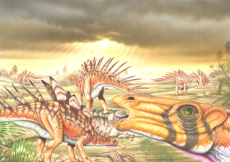 Питание и образ жизниКак и все стегозавриды, шипастый кентрозавр питался исключительно растительной пищей. Строение зубов показывает, что его рацион был схож с рационом оригинального стегозавра: в основном низкорослая растительность, мягкая листва и хвоя. Он вполне мог дотягиваться до крупных ветвей деревьев, вставая на задние конечности. В желудок отправлялись и более изысканные образования, такие как цветы да плоды, изобилующие в перманентно тёплом климате.Судя по близлежащим останкам, объединялись в довольно крупные стада. Так им было гораздо удобнее защищаться от недремлющих хищников. Ощетинившаяся группа кентрозавров была вполне способна отпугнуть любого мелкого или среднего теропода. Среди врагов колючих динозавров выделялся ловкий долговязый элафрозавр, рыскающий по позднеюрской Танзании в поисках лёгкой добычи. Не менее грозным врагом являлся ветерупристизавр. ![]() Трёхмерная реконструкция кентрозавров от Рауля Луниа, дизайнера из Эстонии. Близкие родаПредставители близких семействАвтор статьи: ArgusEye |
