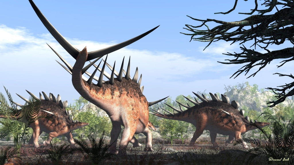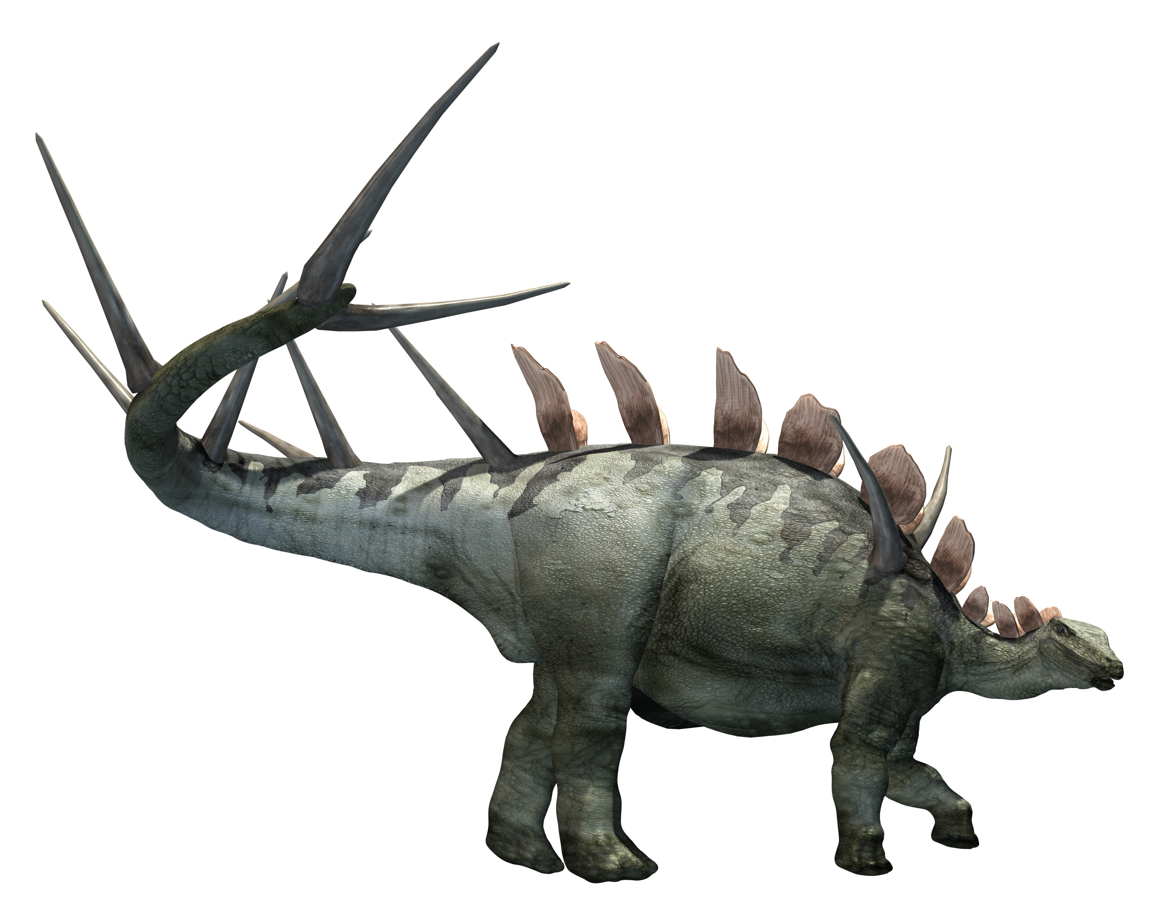 Время и место существованияСуществовали кентрозавры в конце юрского периода, около 155,7 – 150,8 миллионов лет назад (киммериджский ярус). Были распространены на территории современной Танзании.![]() В трёхмерной сцене американского дизайнера Френка Деноты кентрозавр высоко поднимает своё орудие. Виды и история обнаруженияНыне известен единственный вид – Kentrosaurus aethiopicus, соответственно являющийся типовым.Первые останки кентрозавров были обнаружены немецкой экспедицией в танзанийской формации Тендагуру в 1909 году. 24 июля 1910 глава экспедиции Вернер Яненш опознал в них представителя подотряда стегозавров. Его коллега-палеонтолог и также член этого похода Эдвин Хенниг описал кентрозавра в 1915 г. В начале статьи мы уже упомянули по какой причине учёный выбрал такое название. Что касается имени вида aethiopicus, то оно переводится как "амхарский" и формально обозначает африканское происхождение. За время экспедиции было обнаружено около целых 1200 различных костей стегозаврида, но достаточно полных скелетов обнаружить не удалось. Несмотря на это, многие кости находились в сочленениях, что позволило учёным полностью восстановить облик кентрозавра. Среди них был почти полный хвост, тазобедренная часть, несколько соединённых спинных позвонков и фрагменты конечностей одного животного. Именно они сформировали ядро реконструкции Яненша, которая после сборки была выставлена в Берлинском Музее Естествознания. К сожалению, часть "тысячной коллекции образцов" кентрозавров была уничтожена во время массированных воздушных атак Второй Мировой Войны. После считалось, что череп, позвоночник и ряд других фрагментов главного экспоната были утеряны или уничтожены. Какова же была радость хранителей музея, когда спустя десятки лет все они были обнаружены в обыкновенном ящике в подвальном шкафу. Видимо, кто-то успел позаботиться о сохранности останков кентрозавра в трудный момент. В 2006 и 2007 годах реконструкция Яненша была перебрана и уже вновь собрана в позе с учётом современных исследований. Ныне вся база уцелевших материалов, число которых насчитывает около 350 элементов, хранится в Берлинском Музее Естествознания. Ещё один частичный скелет, насчитывающий приблизительно 50% окаменелых костей кентрозавра, выставлен в Тюбингемском университете. Отметим также, что в 1914 году американский палеонтолог Чарльз Гилмор обнаружил фрагменты вида Stegosaurus longispinus, которые были предложены как американский вид кентрозавра. Но тезис был отклонён массой учёных, и вид по сей день принадлежит стегозавру. Строение телаДлина тела кентрозавра достигала 4,5 метров. Высота же до 2 метров с учётом шипов. Весил он до 670 килограммов.![]() Он является одним из самых маленьких стегозавров и, как следствие, одним из самых подвижных. Перемещался кентрозавр на четырёх ногах. Задние были значительно длиннее и сильнее передних, что отражает свойства предков стегозавров. Немногим более половины длины тела отводится гибкому хвосту. В том числе из-за этого центр массы имеет нестандартное положение для четвероногих животных. Точка находится в передней части таза и больше свойственна, например, двуногим орнитоподам. Однако расположение бёдер кентрозавра, глубоко поставленных в тазовую область типично для четвероногих стегозавров и не предполагает полный перенос нагрузки на задние коне