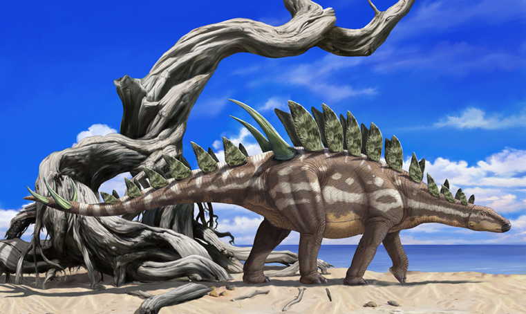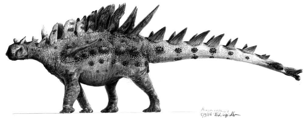 Время и место существованияСуществовали хуаянозавры в середине юрского периода, около 168,3 – 163,5 миллиона лет назад (батский и келловейский ярусы). Были распространены на территории современного Китая, в провинции Сычуань. На текущий момент хуаянозавры являются самыми ранними представителями стегозавров. Жили они приблизительно на 15 миллионов лет раньше самого знаменитого своего североамериканского родственника, стегозавра (Stegosaurus). Это подкрепляет теорию об азиатском истоке всего отряда.![]() Итальянский палеохудожник Франко Темпеста увидел пластинчатого ящера таким. Виды и история обнаруженияНыне известен единственный вид – Huayangosaurus taibaii, соответственно являющийся типовым.Ископаемые остатки хуаянозавра были обнаружены в карьере Дашаньпу, в 11 километрах от городского округа Цзыгун (провинция Сычуань, Китай). Это геологическая формация Нижняя Шасимяо, принадлежащая более крупному образованию Дашаньпу. ![]() Художественное воплощение динозавра от болгарского палеохудожника Владимира Николова. В основу была взята скелетная реконструкция Грегори Пола, которая будет приведена позднее. Описание хуаянозавру дали в 1982 году три китайских палеонтолога: Дун Чжимин, Тан Чжилу и Чжоу Шиу. В начале статьи мы объяснили родовое название хуаянозавра. Отметим также, что иногда в популярной литературе его некорректно переводят как хуаянгозавр. Видовое имя taibaii дано в честь знаменитого китайского поэта Ли Бо (его также иногда именуют Ли Бай или Ли Тай-бо), жившего во времена династии Тан. Голотип хуаянозавра получил ярлык IVPP V.6728. Он включает полный череп, пять позвонков, фрагменты конечностей и три пластины. Помимо него было излечено ещё шесть экземпляров, в сумме позволивших успешно реконструировать большую часть скелета. Отдельно отметим почти полный скелет с черепом, образец ZDM T7001. ![]() Трёхмерная модель, реализованная японским дизайнером Масато Хаттори. Поэтому на текущий момент хуаянозавр считается наиболее изученным ранним стегозавром. Однако важно заметить, что некоторые вопросы по морфологии скелета всё ещё остаются. Строение телаДлина тела хуаянозавра достигала 4,5 метров. Высота же до 1,7 метров. Весил он до 475 килограммов. Является одним из самых лёгких и низких стегозавров.![]() Передвигался хуаянозавр на четырёх толстых ногах, причём задние были несколько длиннее передних. Хотя он не отличался выдающимися беговыми качествами, в целом был несколько подвижнее более крупного родича, стегозавра. Отличается относительно массивным и коротким черепом. Столь необычная голова с широким основанием порождает некоторые ассоциации, связанные с ранними анкилозаврами. Предчелюстная кость хуаянозавра оснащена зубами. Костные пластиныОтдельно стоит уделить внимание необычным пластинам хуаянозавра, протянувшихся двумя рядами от шеи до конца хвоста. Они серьёзно отличаются от высоких просторных пластин оригинального стегозавра или от шипастой спины кентрозавра (Kentrosaurus). Мы видим небольшие структуры с неровными контурами. Это свидетельство ранней стадии развития элемента. В зависимости от места на спине, форма их также различается.![]() Иллюстрация в мягких тонах, сотворённая японским художником Кэйдзи Тэракоси. Если в середине шеи они похожи на небольшие кривые раковины моллюсков, то в области таза превращаются в шипы. Скорее всего, 
