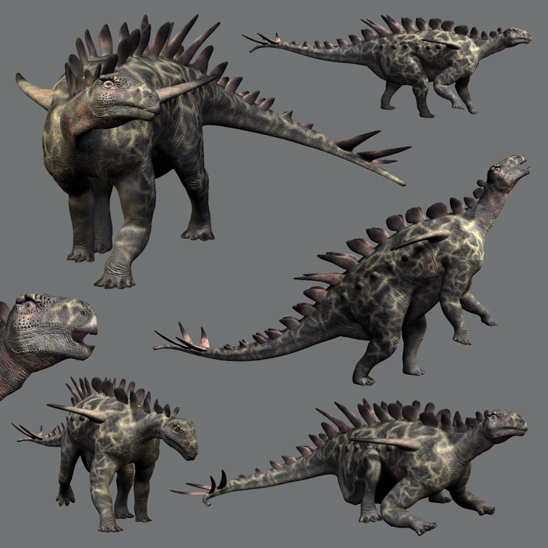 Питание и образ жизниС самого начала своей эпохи и вплоть до её завершения стегозавры не меняли свой глобальный рацион. Это была преимущественно стелющаяся растительность и нижние ярусы древовидных форм. Однако сами виды растений могли быть достаточно разнообразными: вся вариативность саговников, папоротников и хвойных. Группы хуаянозавров неспешно перемещались по разрежённым лесам и широким зелёным равнинам в поисках должного пропитания. Они отнюдь не были такими же требовательными, как их гигантские родственники, стегозавры.![]() 3D-хуаянозавр в разных позах от эстонского художника Рауля Луниа. Но и им всегда приходилось быть начеку, ведь за каждым деревом или холмом могла поджидать опасность. Кто же был естественным врагом хуаянозавра? Многообразие плотоядных динозавров не могло не соответствовать изобилию растительноядных. От небольших хищников взрослых хуаянозавров защищали размеры и достаточно толстая чешуя. Поэтому те нападали в основном на детёнышей, либо охотились за яйцами. Самым опасными же врагами можно считать крупнейших тероподов тогдашнего Сычуаня – янхуанозавра (ранний вид Yangchuanosaurus zigongensis) и кайцзянозавра (Kaijiangosaurus). Так как хуаянозавр не обладал высокой скоростью передвижения и особой ловкостью, ему оставалось надеяться лишь на свою внешнюю защиту. ![]() Ещё одно изображение динозавра без лопаточных шипов. Автор – Джеймс Рис. Далее шли хищники сопоставимых с хуаянозавридом длин, такие как сюаньханьзавр (Xuanhanosaurus) и газозавр (Gasosaurus). Возможно, они нападали на хуаянозавров не только в одиночку, но и небольшими группами. Ведь при встрече с крупными противниками динозавр мог показать весь свой потенциал, поворачиваясь к ним боком и размахивая хвостом с опасными шипами. Даже если и не удавалось травмировать нападающего точным попаданием, сама демонстрация способностей могла отбить всякое желание к действию. Соседствующие хищные противникиБлизкие родаПредставители близких семействГалерея рисунковЩелкните на интересующую миниатюру для увеличения. Снизу указан художник.