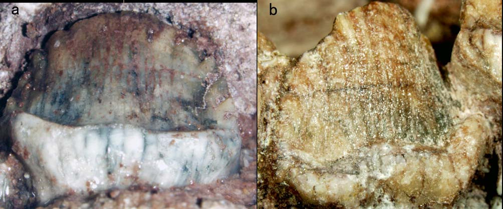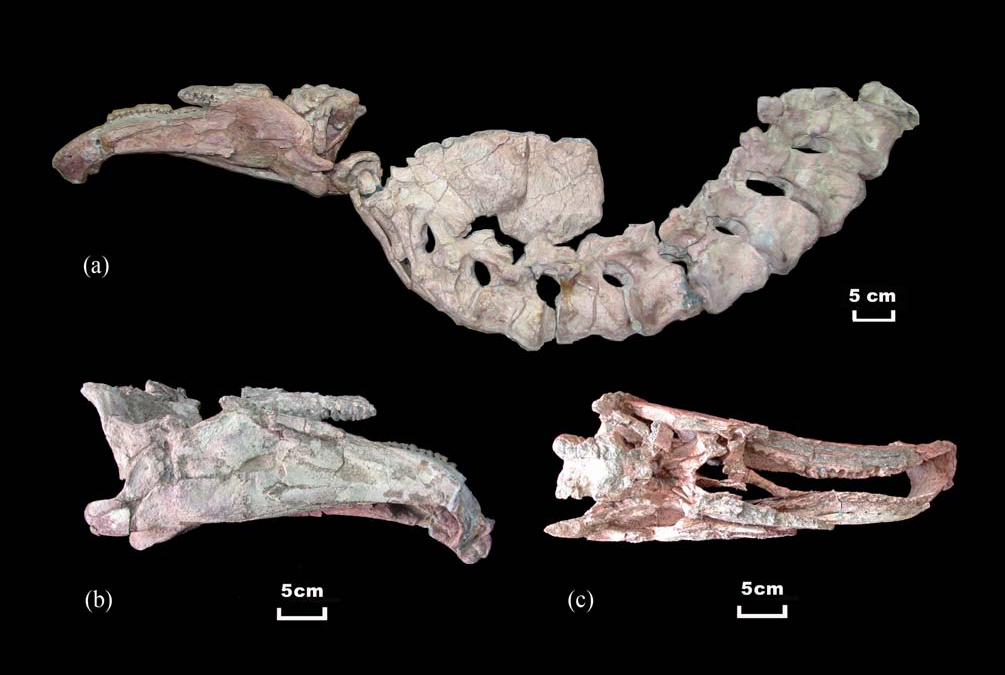 Время и место существованияСуществовали цзянцзюнозавры в конце юрского периода, около 163,5 – 157,3 миллиона лет назад (оксфордский ярус). Были распространены на территории современного Китая, в Синьцзян-Уйгурском автономном районе. Это первый и пока единственный юрский стегозавр из Джунгарии.![]() Воплощение цзянцзюнозавра руками китайского художника динозавров Fafnirx. По его словам, в основу легли реконструкции облика другого древнего стегозаврида из Китая, цзялинозавра (Chialingosaurus). Виды и история обнаруженияНыне известен единственный вид – Jiangjunosaurus junggarensis, соответственно являющийся типовым.Ископаемые остатки цзянцзюнозавра были обнаружены Лиу Юнфэем в 2002 году в местонахождении Цзянцзюньмяо (Джунгарская впадина, Синьцзян-Уйгурский автономный район, Китай). Породы относятся к формации Шишугоу, широко известной по находкам йинлонга (Yinlong) и гуанлонга (Guanlong). ![]() Место находки показано на карте (Jiangjunmiao). Описала нового динозавра в 2007 г. интернациональная команда палеонтологов: Чэнкай Цзя, Кэтрин Фостер, Син Сюй и Джеймс Кларк. В начале статьи мы объяснили родовое название цзянцзюнозавра. Видовое имя junggarensis также отражает место обнаружения ящера, но уже в боле широких масштабах – Джунгарскую впадину. Голотип и одновременно единственный экземпляр цзянцзюнозавра получил ярлык IVPP V 14724. ![]() Фотография IVPP V 14724 из первоописания.[1] Он включает частичный череп (сюда входит почти полная нижняя челюсть с зубами), 11 сочленённых шейных позвонков, две шейные пластины, несколько ребер, а также частичную лопатку и коракоид. По словам авторов, остатки принадлежат полувзрослой особи.[1] Строение телаДлина цзянцзюнозавра достигала 6 метров.[2] Высота же до 2 метров. Весил он до 2,5 тонн.[2] Однако, предполагается, что обнаруженные окаменелости принадлежали подростку. Взрослые особи могли быть несколько крупнее.![]() Передвигался пластинчатый ящер на четырёх крепких ногах, причём задние, скорее всего, были несколько длиннее передних. По ряду признаков можно сказать, что цзянцзюнозавр был достаточно медлительным ящером. Хотя, вероятно, несколько подвижнее своего более крупного и знаменитого сородича – стегозавра (Stegosaurus). Голова относительно тела невелика. Ориентировочная длина черепа IVPP V 14724 – 40 сантиметров. Нижняя челюсть у цзянцзюнозавра плавно изгибается вниз. Зубы короткие, мелкие и полукруглые. Туловище позднеюрского динозавра было округлым и тяжеловесным. Скорее всего, оно завершалось мощным хвостом с устрашающими шипами на конце. В целом цзянцзюнозавр представлял собой базального стегозаврида средних размеров. Скелет цзянцзюнозавраОриентировочный вариант черепа Jiangjunosaurus junggarensis с Paleofile.![]() Фотография заднего зуба с верхнечелюстной кости (a) и среднего зуба с зубной кости (b) из описания.[1]