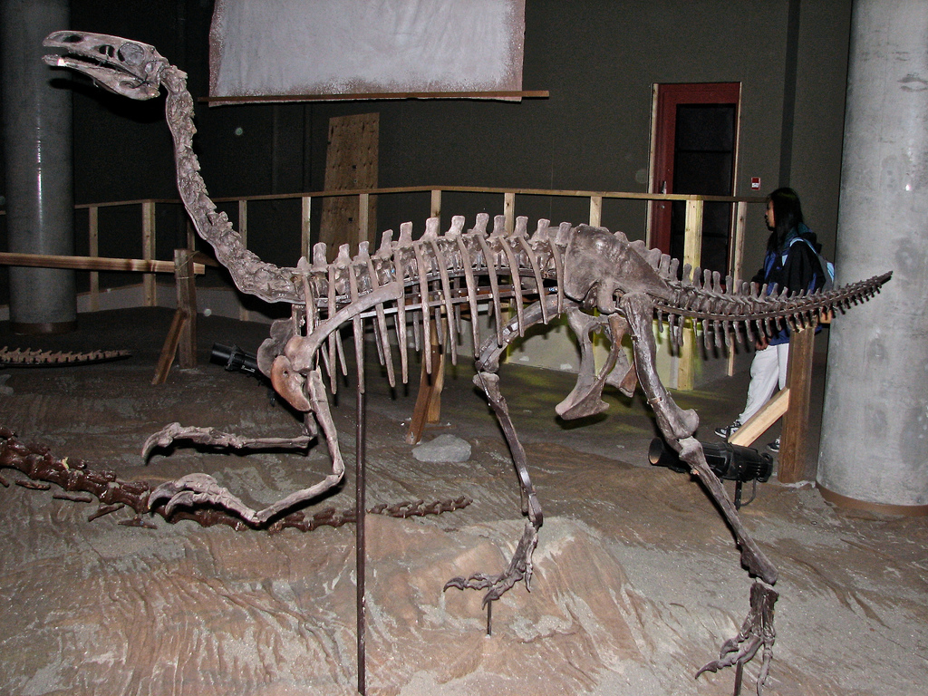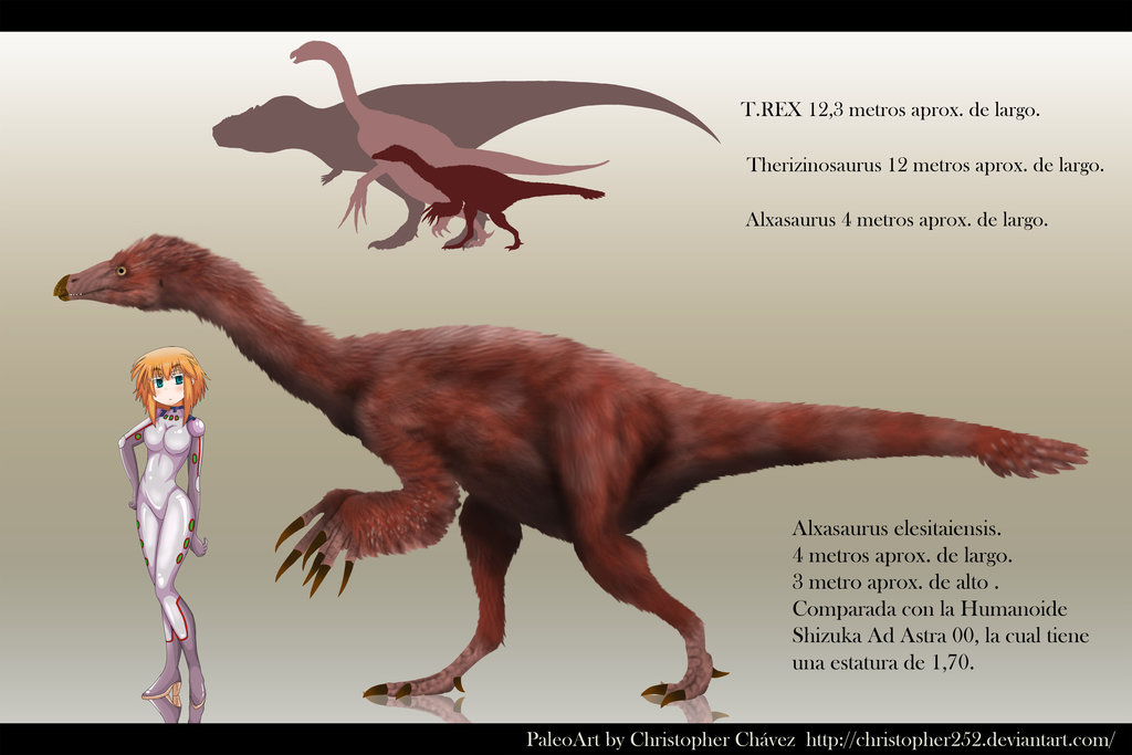 Время и место существованияСуществовали алшазавры в начале мелового периода, около 125 – 100,5 миллиона лет назад (с аптский по альбский ярус). Были распространены на территории современного Китая, в аймаке Алашань, входящем в автономный регион Внутренняя Монголия.![]() Перед нами ярко расписанный алшазавр в исполнении аргентинского художника Габриэля Лио. Виды и история обнаруженияНыне известен единственный вид – Alxasaurus elesitaiensis, соответственно являющийся типовым.Впервые ископаемые остатки алшазавра были обнаружены китайско-канадской экспедицией в период с 21 августа по 2 сентября 1988 года в 1 километре к западу от заброшенной деревни Элеситай и в 23 километрах к западу от деревни Тукему (пустыня Алашань, автономный регион Внутренняя Монголия, Китай). Эта местность принадлежит геологической формации Баинь-Гоби. Описание алшазавру дал канадский палеонтолог Дейл Рассел и его китайский коллега Дун Чжимин в 1994 году. Оно было опубликовано в научном журнале Canadian Journal of Earth Sciences. В начале статьи мы объяснили родовое название алшазавра. Видовое же имя elesitaiensis дано в заброшенного поселения Элеситай, близ которого динозавр был обнаружен. ![]() Трёхмерная модель алшазавра от команды Sparkle. На сей раз выбрана небесная расцветка перьев. Голотип, остатки наиболее крупного и полного индивида, получил ярлык IVPP 88402a. Он включает правую зубную кость с несколькими зубами, кости таза и конечностей, рёбра и большую часть позвоночника, в том числе 5 крестцовых и 19 хвостовых позвонков. Помимо него известны ещё четыре экземпляра алшазавра: IVPP 88301, IVPP 88402b, IVPP 88501 и IVPP 88510. Вместе они позволяют реконструировать животное почти полностью, исключая лишь череп. Строение телаДлина тела алшазавра достигала 3,8 метров. Высота же до 1,9 метров. Весил он до 380 килограммов (вес крупной зебры).![]() Сравнение северокитайского динозавра с человеком, теризинозавром и тираннозавром, произведённое чилийским палеохудожником Кристофером Чавесом. Передвигался китайский ящер на двух ногах, достигавших в длину приблизительно 1,5 метров. Высота в бёдрах – до 1,5 м. Передние конечности также были довольно длинными (около 1 м). Они заканчивались тремя пальцами с внушительными острыми когтями. Эти детали показывают, что алшазавр достаточно регулярно пользовался передними конечностями. Они могли пригодиться при добывании пищи или защиты от хищников. По всей видимости алшазавр, как и большинство теризинозавров, не отличался выдающимися скоростями, хотя и был значительно подвижнее своего легендарного родственника – теризинозавра (Therizinosaurus). К сожалению, череп полностью не сохранился: известен лишь фрагмент нижней челюсти. Однако на базе ближайших таксонов можно сделать вывод, что он был небольшим, узким и вытянутым. Прямые небольшие зубы алшазавра снабжены листовидными зазубренными коронками. Туловище раннемелового динозавра было несколько бочковидным и уже начинало контрастировать с тонкой шеей и маленькой головой. ![]() Китайский художник Чэун Чун Тат предлагает довольно густое оперение. Несмотря на то что большинство художественных реконструкций изображают алшазавра оперённым, признаки перьев пока не были обнаружены. Однако наличие таковые у довольно близкого бэйпяозавра (Beipiaosaurus), также обитавшего в Китае, действительно придают больший вес этой версии. В отличие от более ранних тер