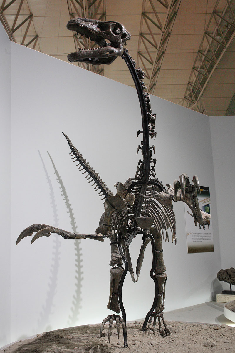 Время и место существованияСуществовали эрляньзавры в конце мелового периода, около 98,5 – 70,6 миллиона лет назад (с сеноманского по ранний маастрихтский ярус). Были распространены на территории современного Китая, в автономном регионе Внутренняя Монголия.![]() Одно из немногих художественных воплощений эрляньзавра. Автор: FunkMonk. Перья здесь – не более чем предположение. Подобные структуры обнаружены не были. Виды и история обнаруженияНыне известен единственный вид – Erliansaurus bellamanus, соответственно являющийся типовым.В 1999 году в местечке Санхангоби, расположенного на 20 км юго-западнее городского уезда Эрэн-Хото (автономный регион Внутренняя Монголия, Китай), был обнаружен целый набор ископаемых остатков позднемеловых теризинозавров. Эти породы относятся к формации Ирен-Дабасу. В 2001 году выходит описание первого из "новоприбывших" – неймонгозавра (Neimongosaurus). Спустя год был описан второй – эрляньзавр. Автором научного труда "A new therizinosauroid (Dinosauria, Theropoda) from the Upper Cretaceous Iren Dabasu Formation of Nei Mongol" стала интернациональная бригада палеонтологов: Син Сюй, Сяохун Чжан, Пол Серено, Сицзинь Чжао, Сюэвэнь Куан, Цзюнь Хань и Линь Тань. В начале статьи мы объяснили родовое название эрляньзавра. Видовое же имя bellamanus переводится с латинского как "прекраснорукий". Поводом послужили хорошо сохранившиеся передние конечностей с крупными когтями. Единственный обнаруженный экземпляр и, соответственно, голотип эрляньзавра получил ярлык LH V 0002. Он включает пять позвонков, левую переднюю конечность без запястья, частичную правую подвздошную кость, фрагменты седалищной и лобковой костей, правую бедренную кость, обе большеберцовых кости, правую малоберцовую и несколько частичных плюсневых костей. Строение телаДлина тела эрляньзавра достигала 3,75 метра. Высота же до 1,3 м. Весил он до 199,5 килограммов.![]() Передвигался китайский динозавр на двух ногах, особой длиной не отличавшихся. Эта деталь вкупе с общей морфологией показывает, что выдающимися скоростными качествами эрляньзавр не обладал. Однако важно заметить, что он был значительно подвижней более крупных родичей, таких как знаменитый монгольский теризинозавр (Therizinosaurus). Передние конечности эрляньзавров были достаточно развитыми и заканчивались тремя пальцами с крупными загнутыми когтями. На большом пальце находился самый впечатляющий из них. Его длина – 9,1 см. ![]() Вы можете полюбоваться фотографией пальцев верхней конечности. Скорее всего, когти использовались как для защиты от хищников, так и для повседневных операций с разнообразными предметами. К сожалению, череп пока обнаружен не был. Но, скорее всего, голова эрляньзавра была маленькой и вытянутой, а зубы прямыми и мелкими. Туловище позднемелового динозавра было достаточно объёмным. Хвост мог быть относительно длиннее, чем у теризинозавра или нотрониха (Nothronychus), а шея несколько короче. В целом эрляньзавр представлял собой небольшого и относительно подвижного теризинозавра. Филогенетическая же позиция "эрляньского ящера" на текущий момент остаётся спорной: часть учёных относит его к самым базальным теризинозавридам (например, Ханьюн Пу и коллеги), часть выносит его за рамки семейства (к примеру, Линдси Занно ставит его в непосредственной близости с алшазавридами). По всем признакам эрляньзавр представляет собой переходную форму от более ранних тер