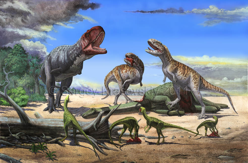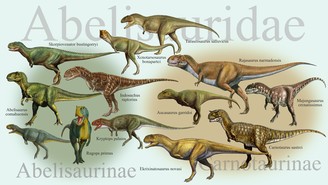 Время и место существованияСуществовали раджазавры в конце мелового периода, около 71 – 67 миллионов лет назад (маастрихтский ярус). Были распространены на территории современной Индии.![]() Коренастое тело абелизаврида, выполненное Тоддом Маршаллом. Виды и история обнаруженияНыне известен один вид – Rajasaurus narmadensis, соответственно являющийся типовым.История обнаружения и классифицирования оного довольно увлекательна. Сначала двумя геологами Дуиведи и Мохабэ, состоящими в Индийской Геологической Службе, были найдены яйца раджазавра. Тогда, естественно, неизвестного. Это произошло во время задания по составлению геологических карт в 1981 году. Рабочие из близлежащего с лагерем известнякового карьера в долине крупной реки Нармада (посёлок Рахиоли, штат Гуджарат, Индия) рассказали учёным о странных круглых образованиях в глубинах извести. Шары оказались ничем иным как яйцами динозавров. Дальнейшее исследование кургана показало, что над яйцами расположены слои крупнозернистого песчаника, в котором находятся богатые залежи окаменелых костей раджазавров. В течение 82-84 годов Суреш Сривастава, работник западного палеонтологического отдела Индийской Геологической Службы, извлёк этого карьера большое число окаменелостей и составил подробную карту. Добыча была переправлена на базу палеонтологического отдела в город Джайпур (штат Раджастан, Индия) для идентификации. Суреш Сривастава и Матур под руководством Панта очистили кости от инородных объектов, а после опубликовали несколько статей с описаниями этих сокровищ. Потом установилось некоторое затишье, и исследования раджазавра возобновились лишь после подписании Меморандума о Взаимопонимании с Пенджабским Университетом в 1994-95 годах. Знаменательным стоит отметить 2001 год, когда к исследовательской работе присоединились американцы. Таким образом, первое научное описание было сделано совместной индийско-американской группой лишь в 2003 г. То есть спустя 22 года после первых находок. В неё входили палеонтологи Джефф Уилсон (Мичиганский Университет), Пол Серено (Чикагский Университет) и уже известный нам Суреш Сривастава. ![]() Как вы уже догадались, название вида narmadensis дано в честь реки, где раджазавр был обнаружен. На карте она выделена синим цветом. Строение телаДлина тела раджазавра достигала 9 метров. Высота же до 4 метров. Весил он до 4 тонн.![]() Передвигался на двух мощных длинных ногах. На нынешний момент является одним из самых массивных абелизавридов. ![]() Сергей Красовский мастерски поместил представителей семейства абелизаврид на один холст. Особое внимание стоит уделить литому 60-сантиметровому черепу, настоящей гордости ящера. Он имел относительно небольшую площадь окон, что существенно укрепляло и утяжеляло всю конструкцию. Это позволяло использовать его, в дополнении к стандартной кусательной функции, как убойный молот. С разбега ударом головы раджазавр мог легко сбить жертву небольших размеров с ног. Над глазами располагался короткий рог, отросток носовой и лобной кости. Назначение последнего малопонятно. Скорее всего, это исключительно украшение, имевшее также некоторую роль в брачный период. Отдалённо раджазавр напоминает своего родственника – майюнгазавра, но череп более массивен. А рог менее выдаётся и находится чуть ближе к носовой части. ![]() Объёмная рекон