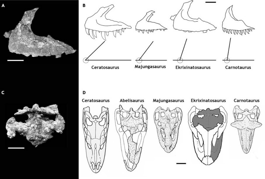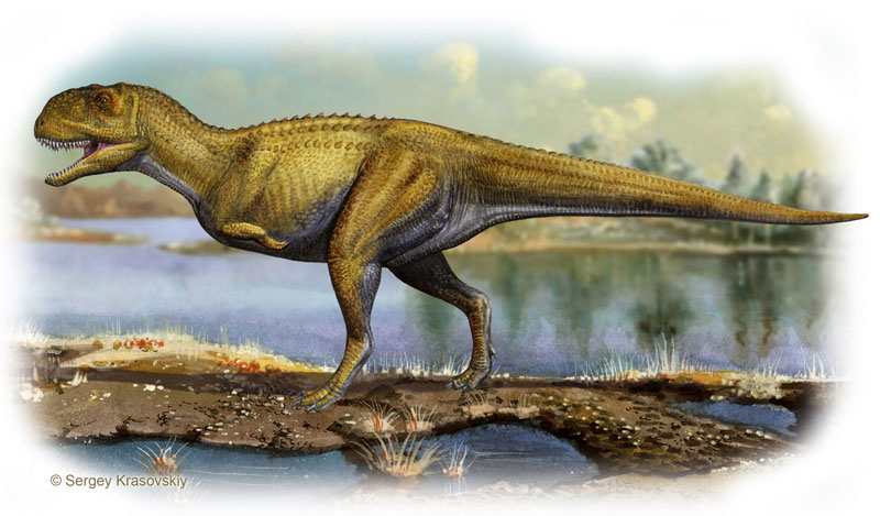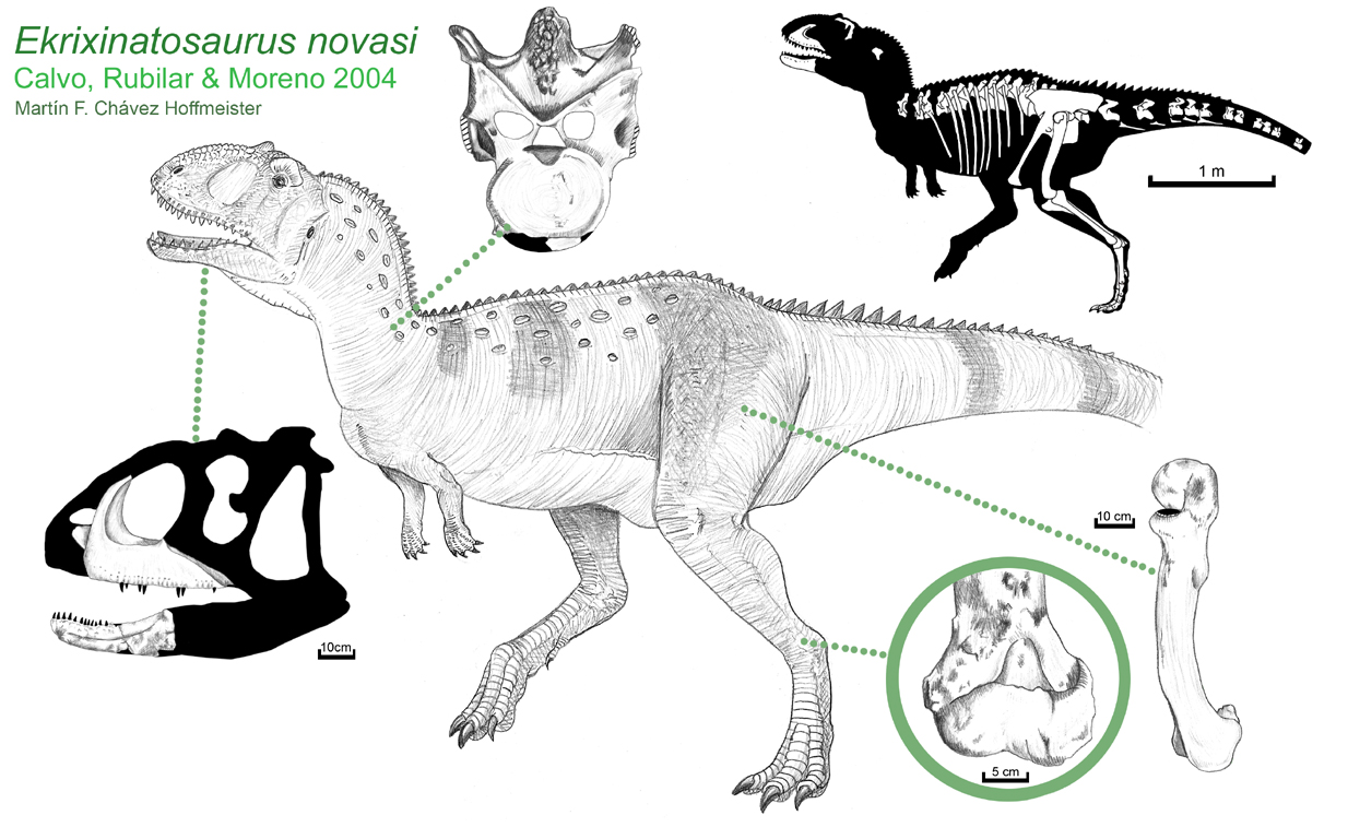 Время и место существованияСуществовали экриксинатозавры в конце мелового периода, около 99 – 97 миллионов лет назад (сеноманский ярус). Были распространены на территории современной Аргентины.![]() Впечатляющая мышечная масса теропода от японского художника Минэо Сираиси. Виды и история обнаруженияНыне известен единственный вид – Ekrixinatosaurus novasi, соответственно являющийся типовым.Находка довольно свежа, потому история исследований невелика. Экриксинатозавр известен только по экземпляру голотипа MUCPv 294, представляющему собой частичный скелет. К сожалению, череп из набора также фрагментарен (смотрите реконструкции ниже). Экземпляр был найден при строительных работах в 34 километрах северо-западнее городка Аньело (провинция Неукен, Аргентина) в 1999 году. Пласты, в которых обнаружена находка, причисляются к богатой формации Канделерос, в свою очередь являющейся частью огромной формации Рио Лемай. Описание экриксинатозавра было сделано аргентинским палеонтологом Джорджем Кальво вместе его с чилийскими коллегами Дэвидом Рубиларом-Роджерсом и Кареном Морено в 2004 г. В 2011 вышла небольшая обобщающая статья с альтернативным размером и анализом характеристик. Строение телаДлина тела экриксинатозавра достигала 7,35 метров.[1] Высота же до 2,5 м. Весил он до 2 тонн.[2]![]() Отметим, что первоначально его длина оценивалась в 7-8 м. В статье от 2011 года на основе аргументов о нестандартных пропорциях размер был пересмотрен до 10-11 м. Некоторое время экриксинатозавр считался крупнейшим абелизавридом. Однако новые числа подвергались убедительной критике. В конце 2016 была произведена переоценка, и результат оказался близким к первоначальному.[1] Передвигался экриксинатозавр на двух сильных ногах, которые были относительно коротки для его семейства. Длина бедренной кости – 77,6 см, а ширина – 11,5. Длина же большеберцовой кости – 69,4 см, а ширина – 10,5. Передние конечности были совсем небольшими, потому в процессе охоты никак не задействованы. Общая форма черепа близка к таковой у майюнгозавра и скорпиовенатора. Но голова экриксинатозавра явно больше, чем у других абелизаврид: как буквально, так и относительно размеров тела. Последние оценки длины черепа – 85 см, а ширины – 34,3 см. Острые закруглённые зубы крупнее, чем у майюнгазавра, карнотавра и других родственников. Следовательно, это был эффективный инструмент атаки и удерживания достаточно крупных растительноядных динозавров. В самых смелых предположениях экриксинатозавр имел небольшой выступ над глазами, как у раджазавра, либо зачатки рожек карнотавра. Расположение глазниц позволяет сделать также промежуточный вывод о достаточно развитом бинокулярном зрении. Обладал весьма крепким телосложением. Позвонки, в частности отверстия в них, имеют немного отличную от других абелизаврид форму. Длинный, относительно тонкий хвост служил экриксинатозавру балансиром при передвижении. ![]() На иллюстрации Сергея Красовского вышедший на охоту динозавр пересекает водоём. Скелет экриксинатозаврНа рисунке представлена реконструкция скелета Ekrixinatosaurus novasi из коллекции чилийского художника Мартина Чавеса (щёлкните для увеличения).![]() Ниже текущая реконструкция черепа: слева фотография найденных фрагментов экриксинатозавра (A и C), а справа сравнение с другими абелизавридами (B и D).