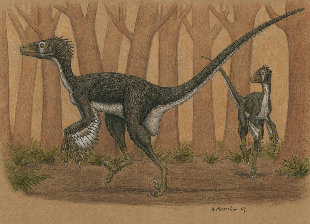 Питание и образ жизниХотя массовые скопления дромеозавров пока не обнаружены, с большой вероятностью они были групповыми охотниками. Это подтверждается наличием довольно мощных для их семейства челюстей. Для того, чтобы поймать мелкого динозавра, ящерицу или земноводное, такие не требуются вообще. Зато подобный инструмент прекрасно подходит для атаки среднеразмерных динозавров, которые могли быть взяты в кольцо сородичами. При этом крепкие головы дромеозавров были способны выдержать ответные удары.Среди потенциальных жертв могли быть молодые хасмозавры, которые отбились или были уведены от общего стада. Также выслеживались подрастающие паноплозавры, ещё не успевшие нарастить мощный панцирь. Однако ни те, ни другие не обладали высокими скоростями. Так где же дромеозаврам могли пригодиться быстрые ноги? Вполне возможно, что организованные группы постоянно гонялись за стегоцерасами, не сильно или вообще не уступающими им в скорости. К тому же и самим дромеозаврам иногда приходилось убегать. Да, ведь у них были серьёзные противники. В частности, при появлении массивного и вечно голодного горгозавра они вынужденно могли оставлять пойманную добычу. Конфликты за еду и территорию также могли возникать между ними и конкурирующими дромеозавридами, например завроритолестами. ![]() Аргентинский художник Эральдо Муссолини изобразил спокойных дромеозавров под прикрытием леса. ВидеоОтрывок из документального фильма "Бойцовский клуб юрского периода": освещается строение тела и поведение в дикой природе.Мог охотиться наБлизкие родаАвтор статьи: ArgusEye |