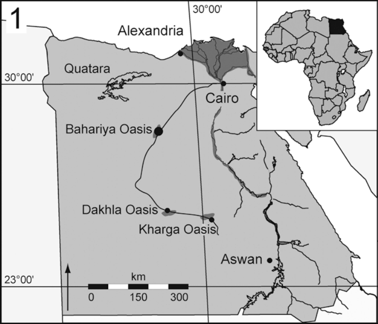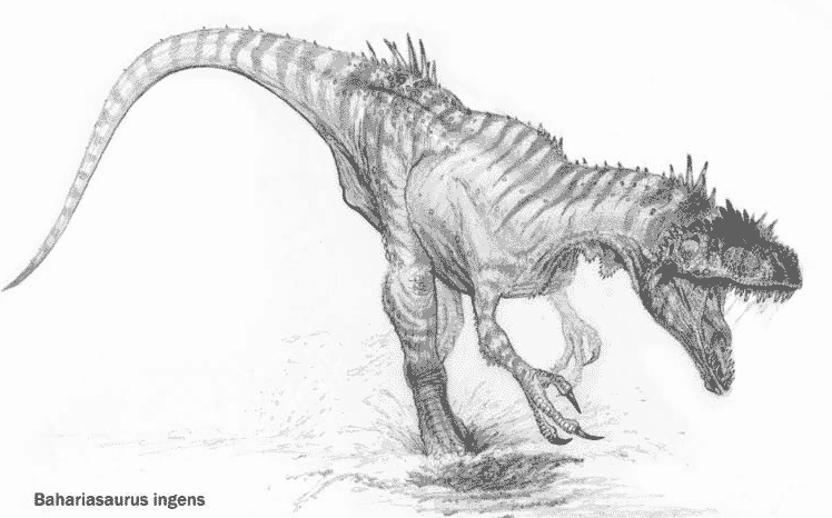 Время и место существованияСуществовали бахариязавры в раннем и позднем меловом периоде, около 113 – 93,9 миллиона лет назад (альбский и сеноманский ярусы). Были распространены на территории современных Египта, Марокко, Алжира и Нигера.![]() Иллюстрация пустынного ящера с GeoCities. Виды и история обнаруженияНыне известен единственный вид – Bahariasaurus ingens, соответственно являющийся типовым.Ископаемые остатки бахариязавра были обнаружены Ричардом Маркграфом, охотником за окаменелостями, в оазисе Бахария (приблизительно 320 км от Каира, мухафаза Матрух, Египет) в 1911 году. Породы относятся к одноимённой сеноманской формации Бахария. ![]() Место первых находок показано на карте (Bahariya Oasis). Описал бахариязавра в 1934 г. известный немецкий палеонтолог Эрнст Штромер.[2] В начале статьи мы объяснили родовое название бахариязавра. Видовое же имя ingens переводится с латыни как "огромный". Нетрудно догадаться, что в нём отражены впечатляющие размеры динозавра. Голотип получил ярлык HM 1922 X47. Он включает 2 спинных и 3 крестцовых позвонка, позвоночную дугу, часть ребра, лобковые кости и ближний конец седалищной кости. Помимо него известно ещё несколько незначительных разрозненных фрагментов, в том числе из формации Кем-Кем (Марокко и Алжир) и группы Тегама (Нигер). ![]() Оскалившийся бахариязавр в исполнении американского художника динозавров Нобу Тамуры. Кроме того, к бахариязавру временно причислены плохоидентифицируемые остатки из формации Алкантара (северо-восток Бразилии). Скорее всего, они принадлежат другому таксону. К сожалению, все ископаемые остатки из оазиса Бахария были уничтожены в ходе Второй мировой войны (бомбардировки Мюнхена в 1944). Специалисты с нетерпением ждут новых открытий. Строение телаДлина тела бахариязавра достигала 11,9 метра. Высота же до 4 метров. Весил он до 4 тонн.![]() Сравнительная иллюстрация африканского ящера от немецкого художника Джошуа Кнуппе. Передвигался хищный динозавр на двух сильных ногах. Длина лобковой кости – 1,03 м. Он не отличался выдающимися беговыми качествами, но, скорее всего, был несколько подвижнее многих тероподов схожей длины. Передние конечности обнаружены не были. Учитывая, что у бахариязавра просматриваются некоторые общие черты с дельтадромеем (Deltadromeus), вполне возможно, что они были хорошо развиты. С другой стороны, это совершенно не обязательно, ибо сверхгигантским тероподам обычно свойственны небольшие верхние конечности. А бахариязавр значительно превосходил дельтадромея в размерах. К сожалению, череп также не найден, поэтому пока лишь можно догадываться о его строении. В общих чертах, скорее всего, он обладал продолговатой формой и был снабжён рядами острейших зубов, аналогичных таковым у дельтадромея. ![]() Грозный бахариязавр, воплощённый на бумаге американским палеохудожником Тоддом Маршаллом. Туловище позднемелового динозавра было вытянутым и относительно облегчённым. Длина крупнейшего позвонка HM 1922 X47 – 20 см. Традиционно для хищных тероподов оно завершалось длинным хвостом. В целом бахариязавр представлял собой прекрасно вооружённого и, предположительно, достаточно универсального гигантского теропода. Филогенетическая позиция точно не определена. Его относили к кархародонтозавридам и даже к тираннозавридам.[1] Однако, близость к дельтадромею, скорее позволяет объединить их в отдельное