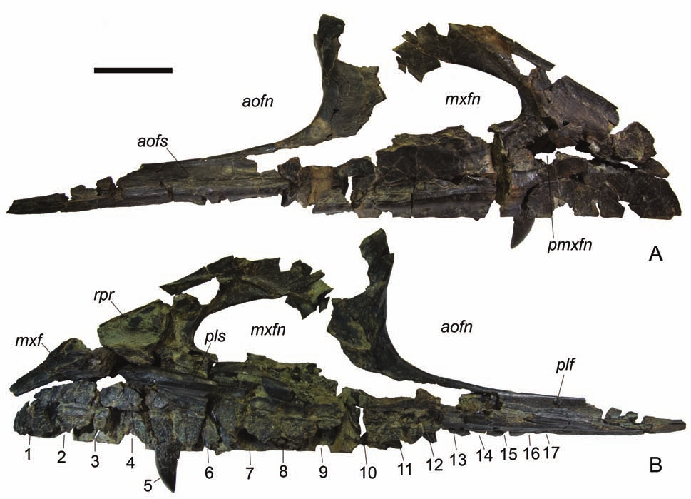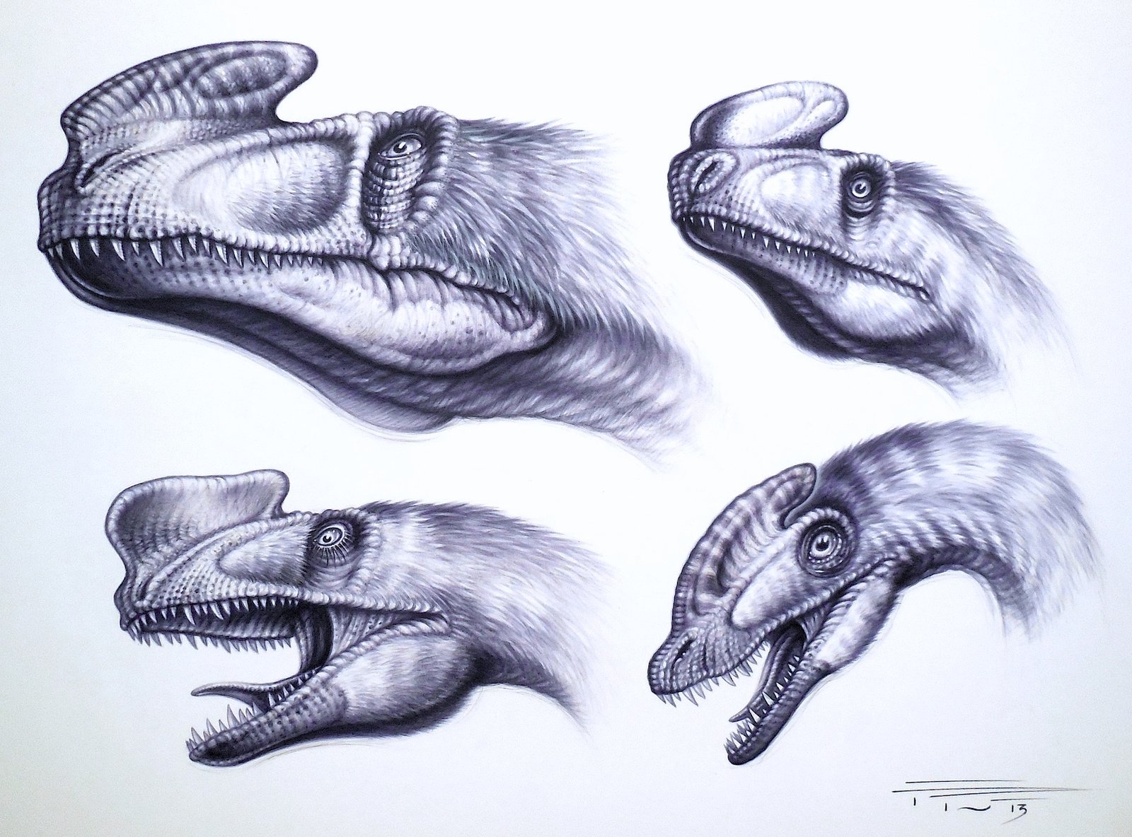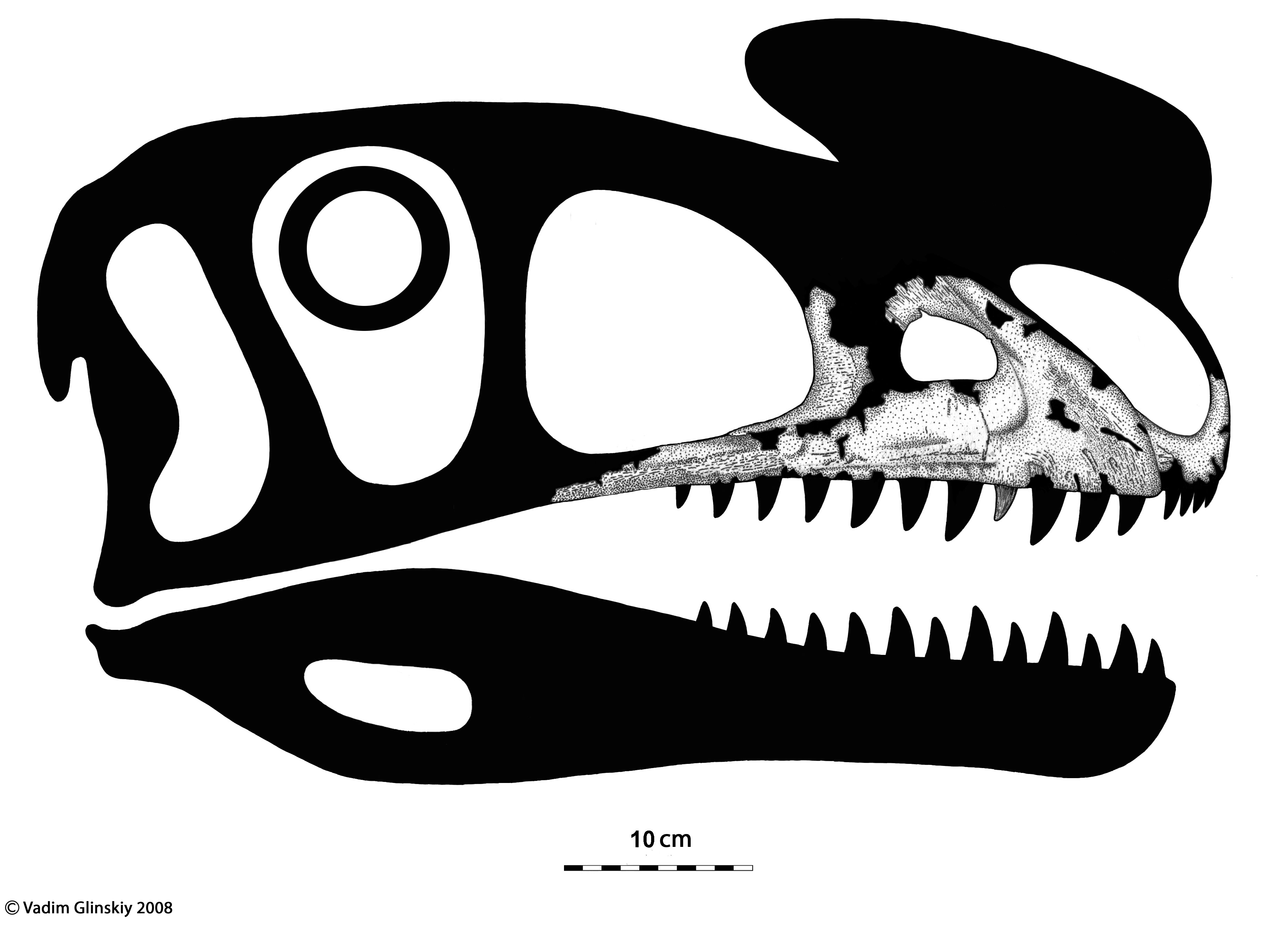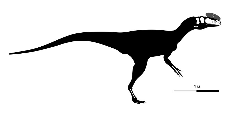 Время и место существованияСуществовали килески в середине юрского периода, около 168,3 – 166,1 миллиона лет назад (батский ярус). Были распространены на территории России, в Красноярском крае. Являются первыми именованными тероподами из этих мест.![]() Мирно прогуливающийся по берегу килеск в исполнении российского палеохудожника Андрея Атучина. На заднем плане устроили купание шарыповские стегозавры. Виды и история обнаруженияНыне известен единственный вид – Kileskus aristotocus, соответственно являющийся типовым.Ископаемые остатки килеска были обнаружены в начале 2000-х годов в Берёзовском карьере (2 км к югу от деревни Никольское, Шарыповский район, Западная Сибирь, Красноярский край, Российская Федерация). Эти породы относятся к верхней пачке Итатской свиты. Окаменелые остатки располагались на площади в 2 квадратных метра. Описание килеска совместно произвели на свет три российских палеонтолога: Александр Аверьянов, Сергей Краснолуцкий и Степан Иванцов. ![]() Насыщенная сцена от палеохудожника Сергея Красовского. Удавшуюся охоту всегда может испортить пришедший на запах сородич. Скорее всего, без стычки тут не обойдётся. В начале статьи мы объяснили родовое название килеска. Видовое имя aristotocus происходит от древнегреческого "благородного происхождения". Оно отражает филогенетическую позицию: ящер является одним из самых ранних представителей клады целурозавров, ставшей впоследствии невероятно успешной и просуществовавшей вплоть до конца мезозоя. Голотип килеска, неполная правая верхнечелюстная кость, получил ярлык ZIN PH 5/117. Помимо него известны ещё несколько образцов, включающих левую предчелюстную кость, задний фрагмент левой надугловой кости, а также несколько костей нижних и верхних конечностей.[1] Строение телаДлина килеска достигала 5 метров. Высота же до 1,7 метров. Весил он до 250 килограммов.![]() Силуэт с вкраплениями обнаруженных костей. Автор: Андрей Атучин. К сожалению, пока известны лишь отдельные фрагменты скелета. Однако приблизительно образ килеска можно восстановить, ориентируясь на остатки ближайших родственников. Передвигался среднеюрский хищный динозавр на двух длинных ногах. Вероятно, был достаточно подвижен. Длинные челюсти полнились рядами острых загнутых зубов. Полная длина верхнечелюстной кости килеска достигает 29 сантиметров. Для сравнения, такова длина всего черепа британского процератозавра. ![]() Головы нескольких процератозавридов от итальянского художника динозавров Фабио Пастори. Слева направо: синотиранн (Sinotyrannus), килеск, процератозавр и гуанлонг. А имел ли место гребень?На текущий момент большинство художественных реконструкций предлагают нам килеска с ярко выраженным гребнем. Таким образом проводятся параллели с близкими родственниками, особенно китайским гуанлонгом.В принципе же этот атрибут не обязателен – нет явных свидетельств. Поэтому вполне допустимы реконструкции с совсем миниатюрным гребнем (который мог иметь место у процератозавра) или вообще без него. ![]() Один из таких вариантов предложил Сергей Красовский. Прочие аспектыПредположительно, туловище юрского динозавра было вытянутым и гибким. Традиционно для тероподов оно завершалось длинным хвостом. В целом килеск представлял собой прекрасно оснащённого ящера средних размеров, сохранявшего хорошую мобильность.Вместе с пр