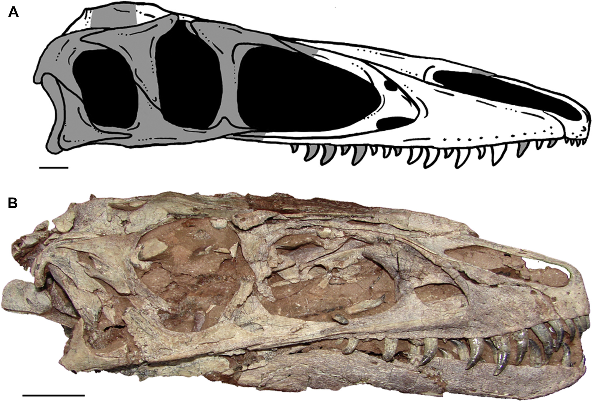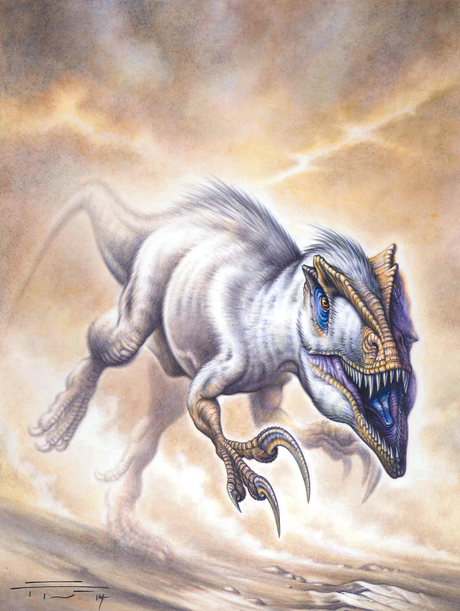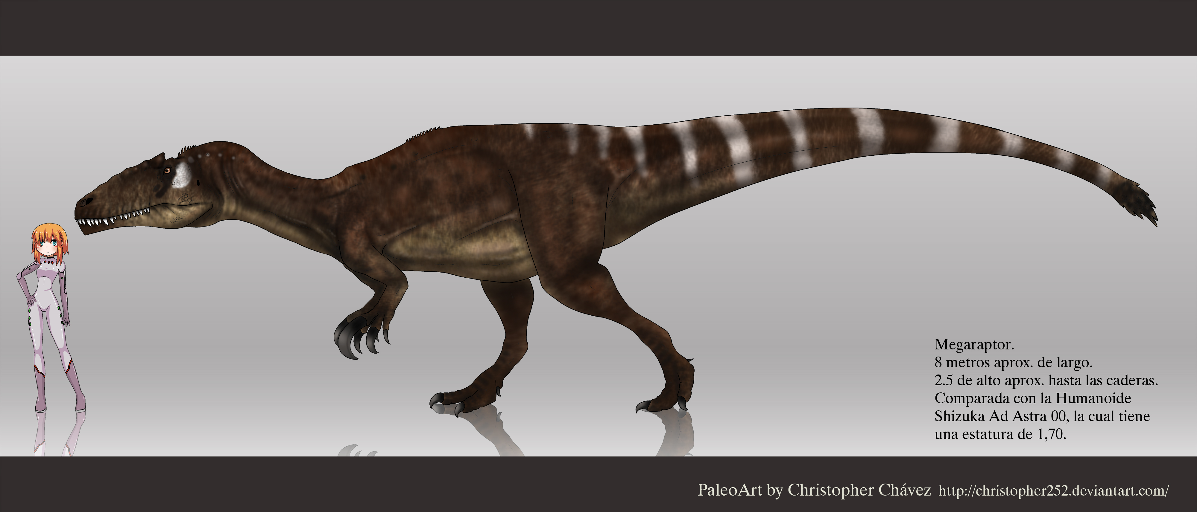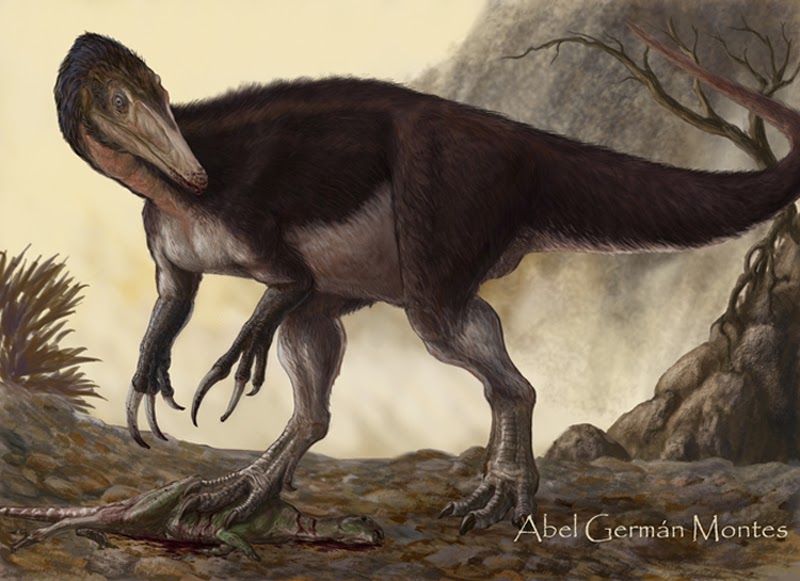 Время и место существованияСуществовали мегарапторы в конце мелового периода, около 93,9 – 86,3 миллиона лет назад (туронский и коньякский ярусы). Были распространены на территории современной Аргентины, в Патагонии.[1]![]() Грозный хищник, исторгаемый песчаной бурей. Иллюстрация итальянского палеохудожника Фабио Пастори. Виды и история обнаруженияНыне известен единственный вид – Megaraptor namunhuaiquii, соответственно являющийся типовым.![]() Горячая встреча с местным крокодилом. Иллюстрация американского дизайнера PaleoGuy. Ископаемые остатки мегараптора были впервые обнаружены в 1996 году в районе горного хребта Сьерра-дель-Портесуэло (провинция Неукен, Аргентина). Эти породы относятся к формации Портесуэло (турон-коньяк), входящую в подгруппу Рио-Неукен. Стоит отметить, что ранее подгруппа считалась формацией, а соответственно Портесуэло – одной из её пачек. Описал мегараптора в 1998 г. аргентинский палеонтолог Фернандо Эмилио Новас. ![]() Одно из первых художественных воплощений мегараптора. Автор: палеохудожник Джо Туцциароне (США). В начале статьи мы объяснили родовое название динозавра. Видовое имя namunhuaiquii является производной слов на языка мапуче (на нём говорят арауканы, индейский народ Аргентины и Чили) и переводится как "копьеногий". Опять же идёт отсылка к гигантскому острому когтю, который, по мнению Новаса, располагался на втором пальце нижней конечности ящера, как у типичных дромеозавроидов. Голотип мегараптора получил ярлык MCF-PVPH 79. Он включает правую локтевую кость, первую фалангу первого пальца передней конечности, коготь первого пальца передней конечности (первоначально считался когтем второго пальца задней конечности) и дистальную половину третьей трубчатой кости правой задней конечности.[1][2] ![]() Предлагаем вниманию ещё одно раннее изображение с "серпом" на ноге, на сей раз от американского художника Тодда Маршалла. В декабре 2004 года выходит описание нового экземпляра мегараптора (MUCPv 341), обнаруженного в той же свите. Находку можно считать крайне важной в историческом контексте. Именно сюда входила почти полная передняя конечность, на первом пальце которой и расположился огромный коготь.[2] Далее в 2014 году выходит описание остатков юной особи мегараптора (MUCPv 595).[4] Помимо перечисленных образцов известно ещё несколько крайне фрагментарных: MUCPv 412, MUCPv 413, MUCPv 1353. Кроме того, известны потенциальные остатки (временно Megaraptor sp.) из свиты Бахо-Барреаль (провинция Чубут, Аргентина). Строение телаДлина мегараптора достигала 8 метров.[3] Высота же до 2,6 м. Весил он до 1 тонны.[3]![]() Сравнительные размеры "огромного расхитителя" от чилийского палеохудожника Кристофера Чавеса. К сожалению, из-за небольшого числа остатков облик ящера пока покрыт завесой тайны. Не обнаружен ни череп, ни относительно полный посткраниальный скелет половозрелой особи. Известно, что передвигался мегараптор на двух сильных ногах. Пожалуй, наиболее изученной и самой известной достопримечательностью аргентинского динозавра являются развитые передние конечности с тремя пальцами. Первый палец на каждой венчался огромным серповидным когтем (до 35 см в длину), вероятно используемым при охоте или разделывании добычи. Коготь второго пальца, хоть и заметно отличается в длине, тоже вполне подходил для этих целей. ![]() Фотография передней конечности мегараптора. Традиционно 