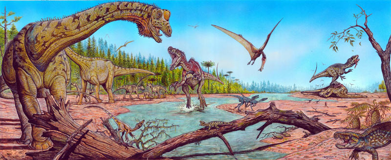 Питание и образ жизниАргентинская формация Портесуэло долгое время находилась в тени своих именитых соседок. Однако ряд знаковых находок, в том числе загадочный мегараптор и титанический футалогнкозавр (Futalognkosaurus), принёс ей мировую известность. Уже сейчас можно приблизительно восстановить фаунистический состав, действительно отличающийся разнообразием.Скорее всего, в Патагонии тогда было не менее жарко, чем сейчас. На уютных равнинах, окружённых влажными лесами, паслись гигантские титанозавриды футалогнкозавры, а также маларгуэзавры (Malarguesaurus) и ринконзавры (Rinconsaurus). Возможно, они были регулярными объектами охоты мегарапторов, в первую очередь это применимо к молодым или больным индивидам. ![]() Фауна Портесуэло на одном холсте от бразильского палеоиллюстратора Маурильо Оливейры. Паре мегарапторов всё же удалось добраться до детёныша футалогнкозавра. Другой потенциальной пищей были игуанодонтные макрогрифозавры (Macrogryphosaurus). У берегов извилистых рек мегарапторы могли подкармливаться крокодилами и черепахами (например, подобными Prochelidella). Теоретически рыба и амфибии тоже могли попадать на обед, особенно если подтвердится вытянутое строение морды у взрослых представителей. Когти в качестве инструмента разделывания и извлечения из панцирей были бы достаточно эффективны. ![]() Именно так представил грозный рёв мегараптора палеоиллюстратор Сергей Красовский. Но были ли у него серьёзные конкуренты в этой местности? Вероятней всего, да. Во всяком случае, обнаружены остатки неидентифицированных абелизавридов и кархародонтозавридов. ![]() Ещё одно изображение американского художника Тодда Маршалла: мегараптор, используя свои когти, валит на землю игуанодонтоида. Что касается небольших дромеозавридов, подобных неукенраптору (Neuquenraptor) или уненлагии (Unenlagia), то, вероятней всего, они располагались ниже в экологической пирамиде. Сверхгигантский сородич — маипКраткая информация о мегарапториде маипе на нашем канале. Растительноядные соседиПримечание: * близлежащая свита Уинкуль.Представители близких семейств (возможные)Другие динозавры из АргентиныАвтор статьи: ArgusEye ЛитератураРекомендуемые научные работы: